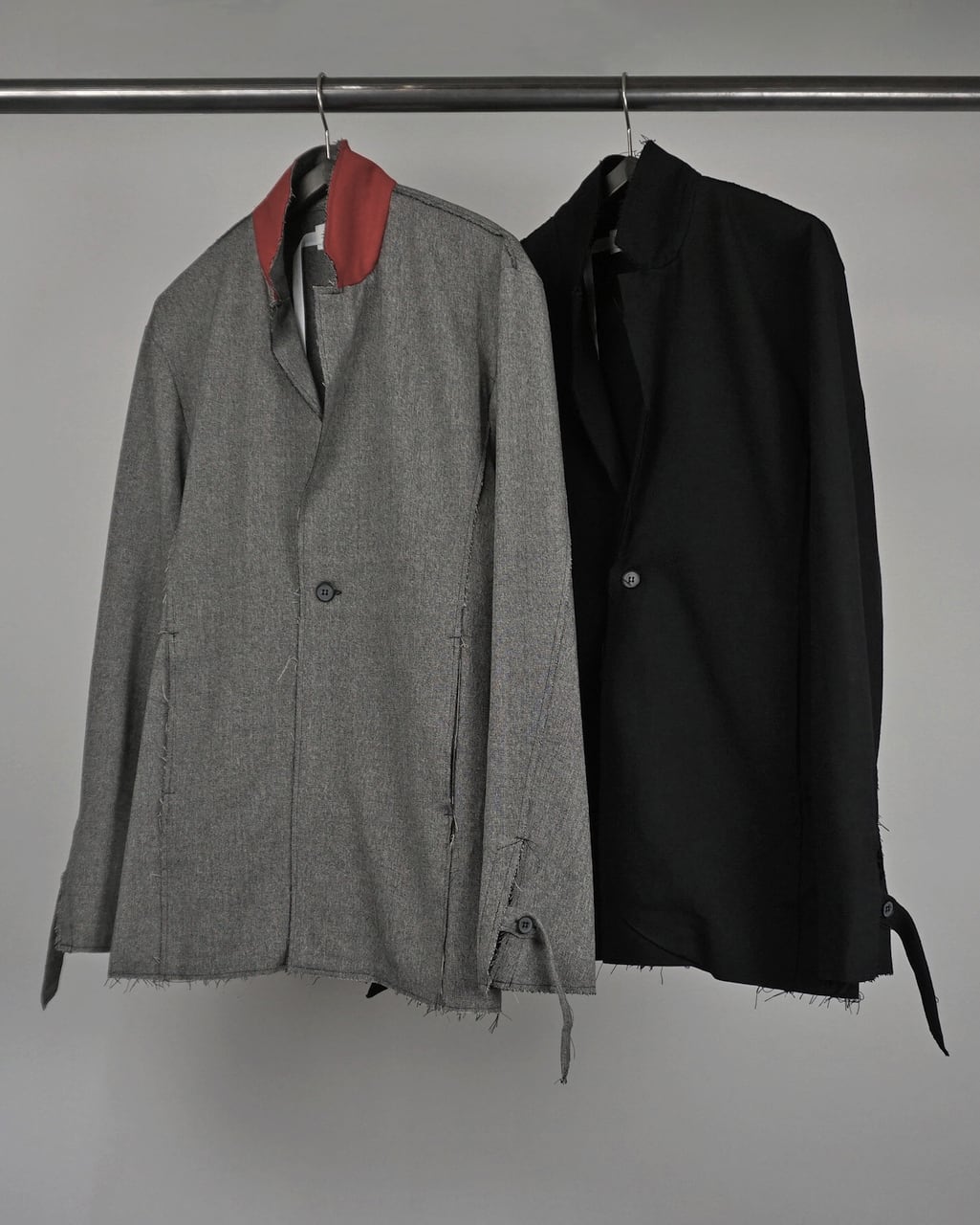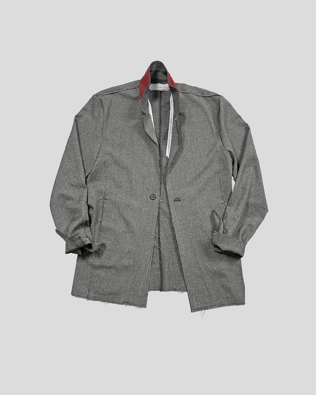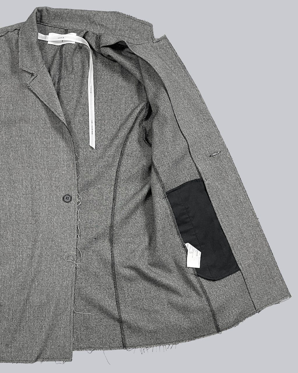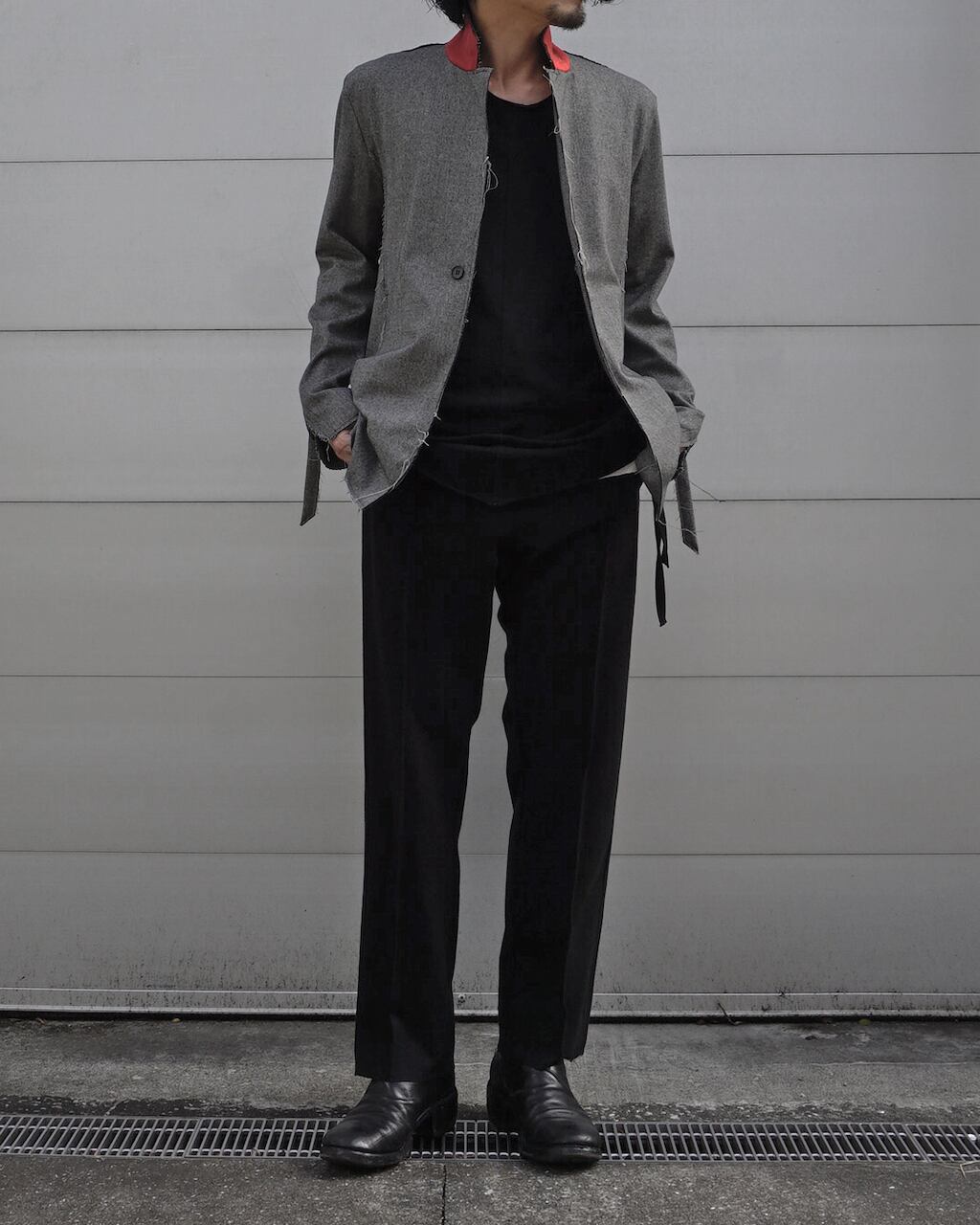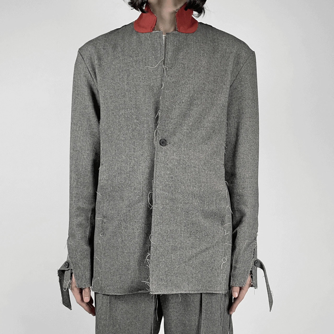 襟を立てスタンドカラーとしてアレンジ可能(SLAB色のみ襟裏が配色)。袖口にはスリットと垂れるコードで通常のジャケットとの差別化を図る。1つボタンでシンプルなスマートフォルム。裾部分等は裁ち切りにし、縫製後に洗い加工をかけることで退廃的なグランジ感を加えた。腰にスリットポケットあり。