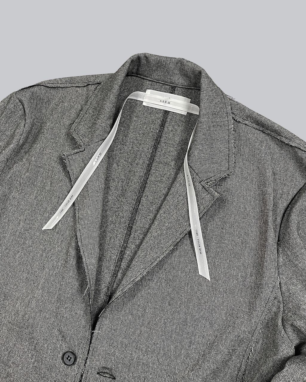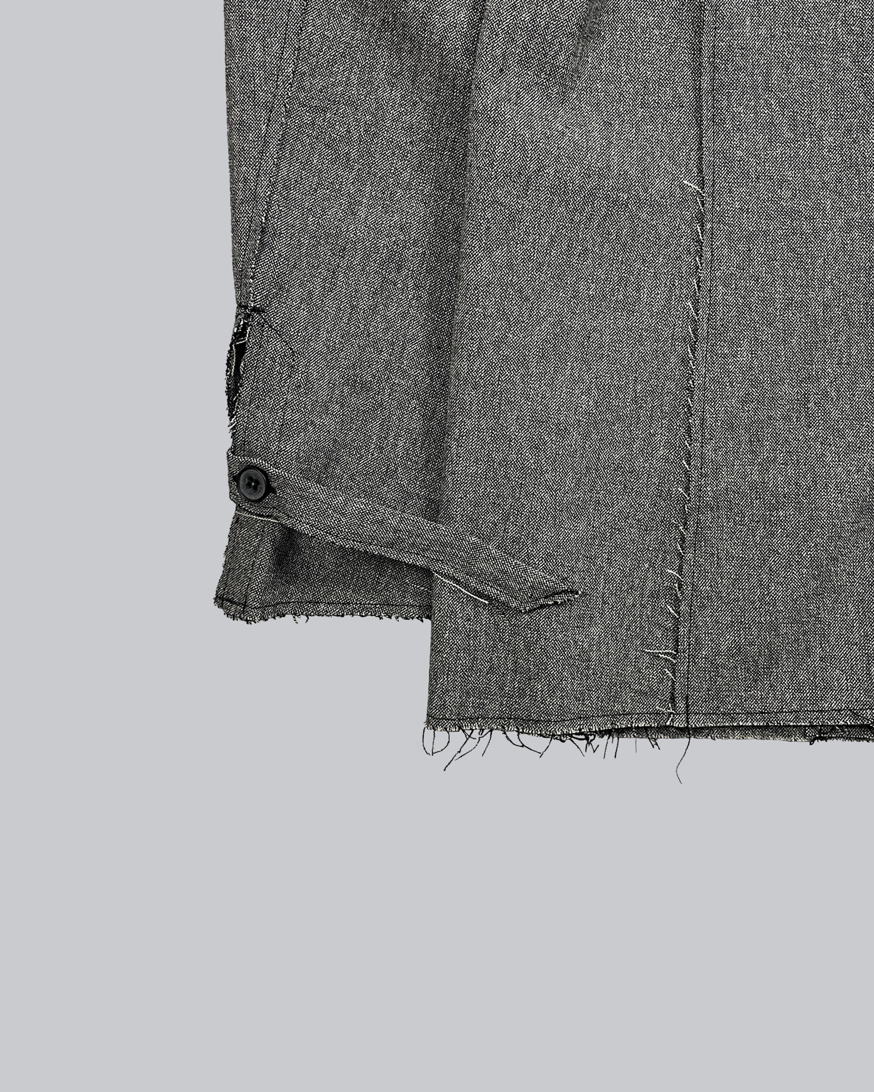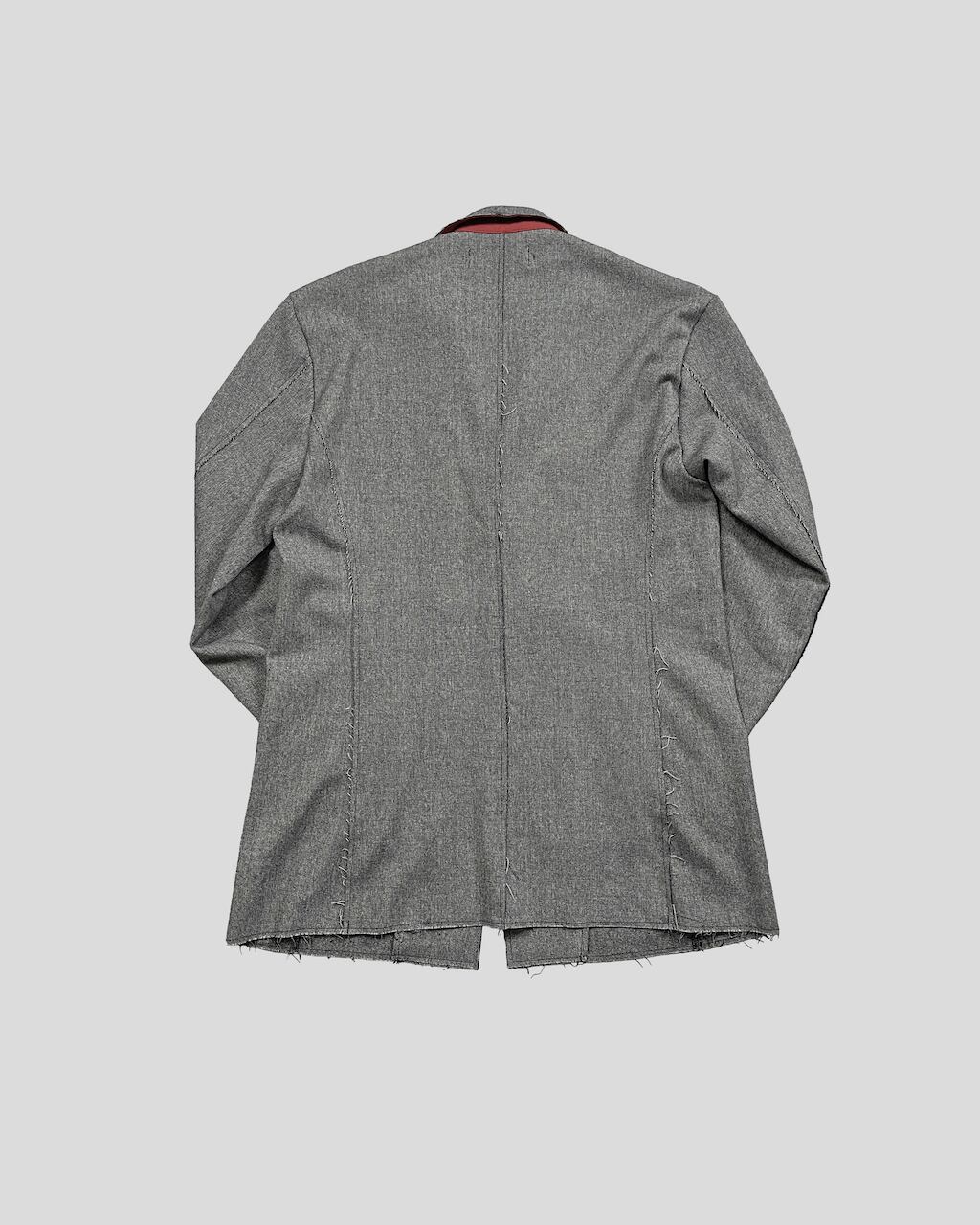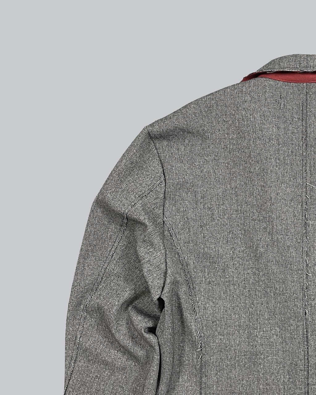 襟を立てスタンドカラーとしてアレンジ可能(SLAB色のみ襟裏が配色)。袖口にはスリットと垂れるコードで通常のジャケットとの差別化を図る。1つボタンでシンプルなスマートフォルム。裾部分等は裁ち切りにし、縫製後に洗い加工をかけることで退廃的なグランジ感を加えた。腰にスリットポケットあり。