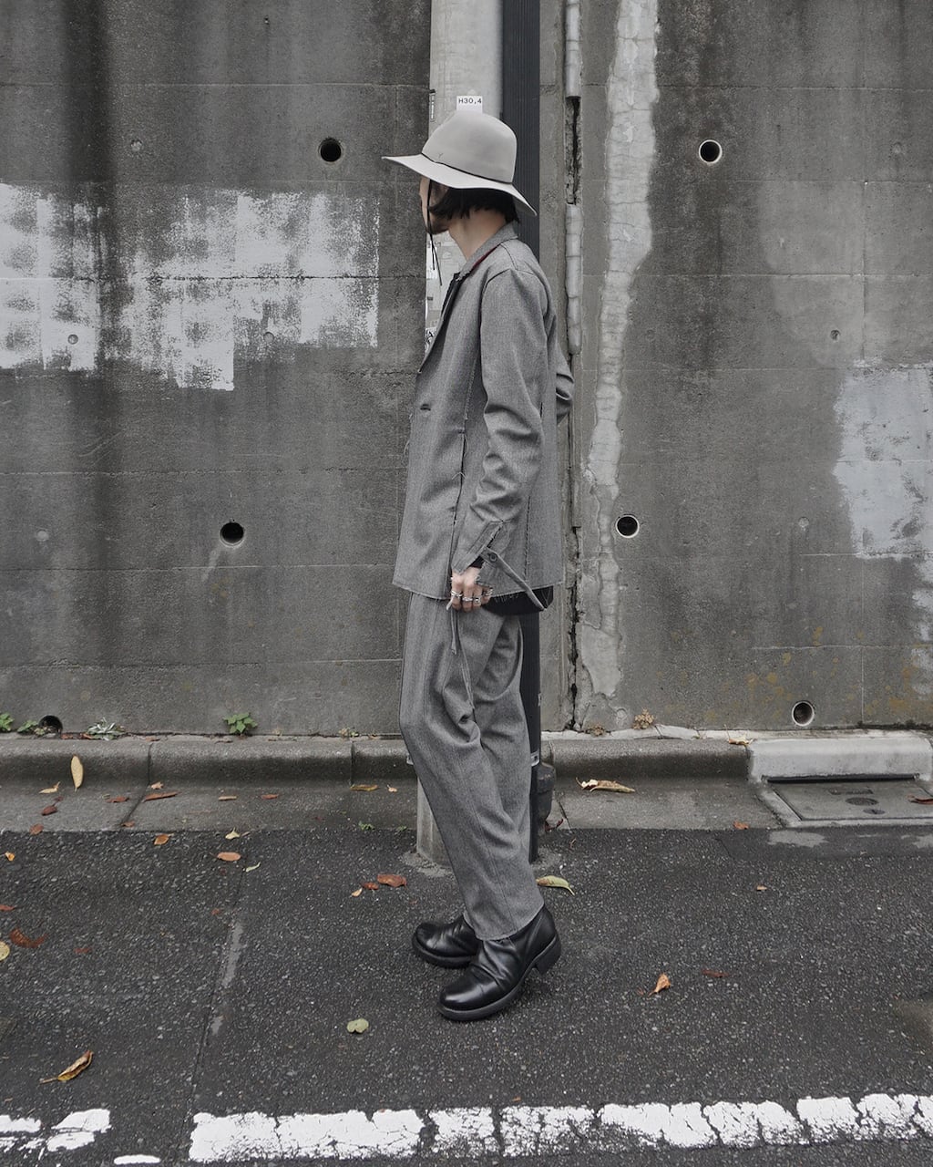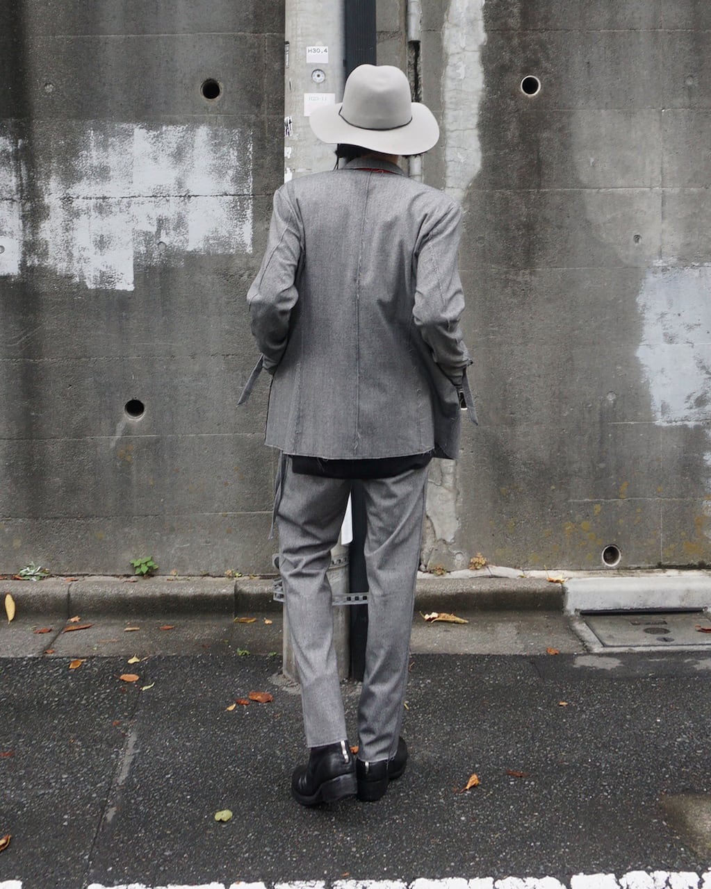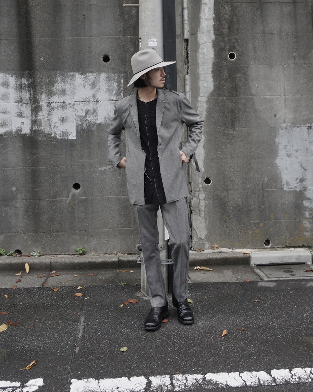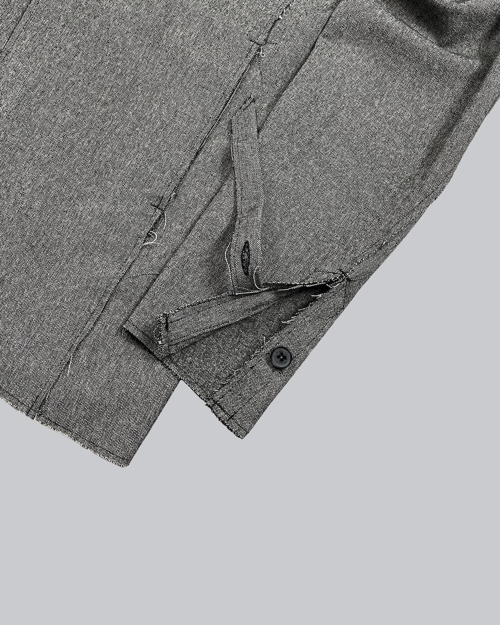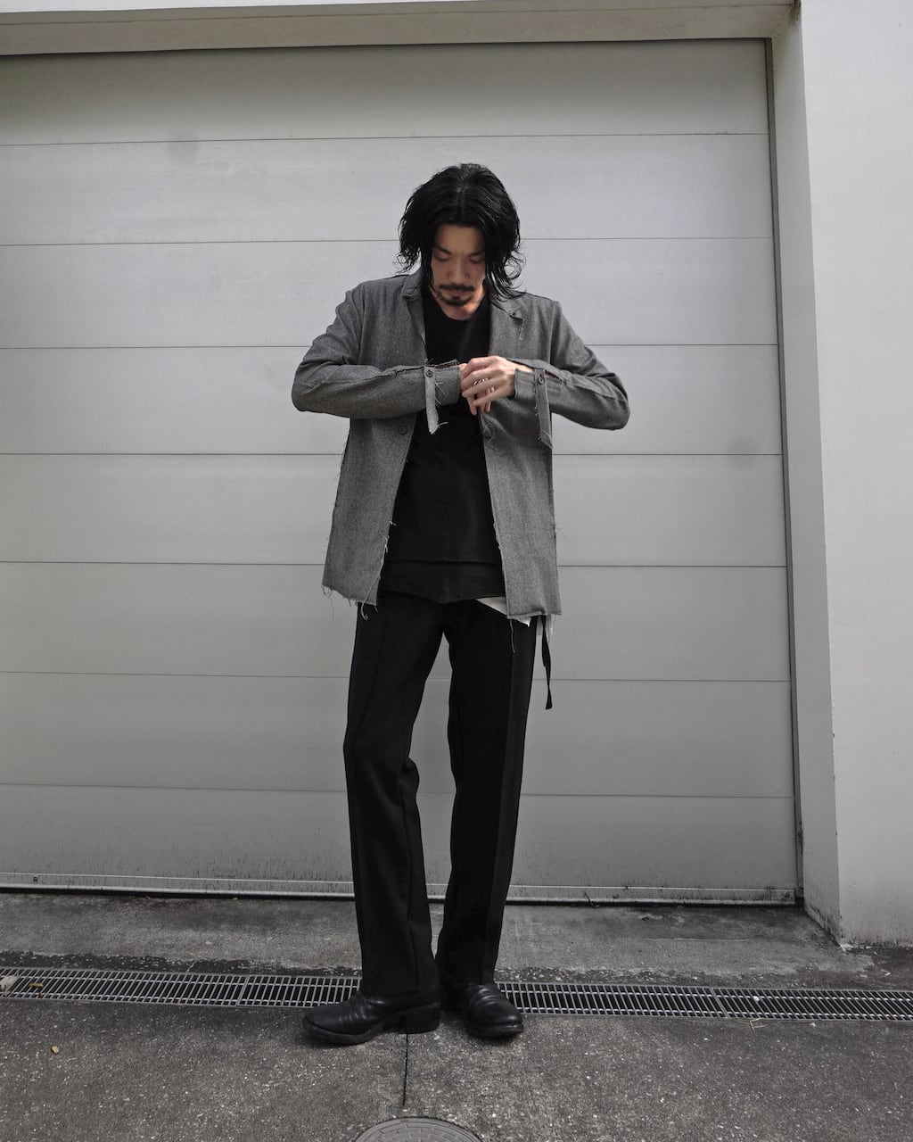 襟を立てスタンドカラーとしてアレンジ可能(SLAB色のみ襟裏が配色)。袖口にはスリットと垂れるコードで通常のジャケットとの差別化を図る。1つボタンでシンプルなスマートフォルム。裾部分等は裁ち切りにし、縫製後に洗い加工をかけることで退廃的なグランジ感を加えた。腰にスリットポケットあり。