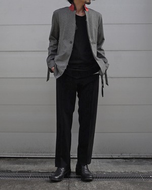 A tailored jacket that can be easily worn without any specific situation in mind. It allows for the option to stand the collar up as a stand collar (only available in the SLAB color with a contrasting color on the collar's underside). The sleeves feature slits and dangling cords to set it apart from a regular jacket. With a single button, it maintains a simple and smart silhouette. The hem and other areas are cut and subjected to a distressed grunge effect through washing. It includes slit pockets at the waist.