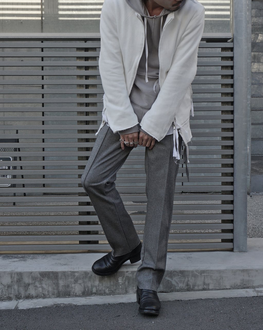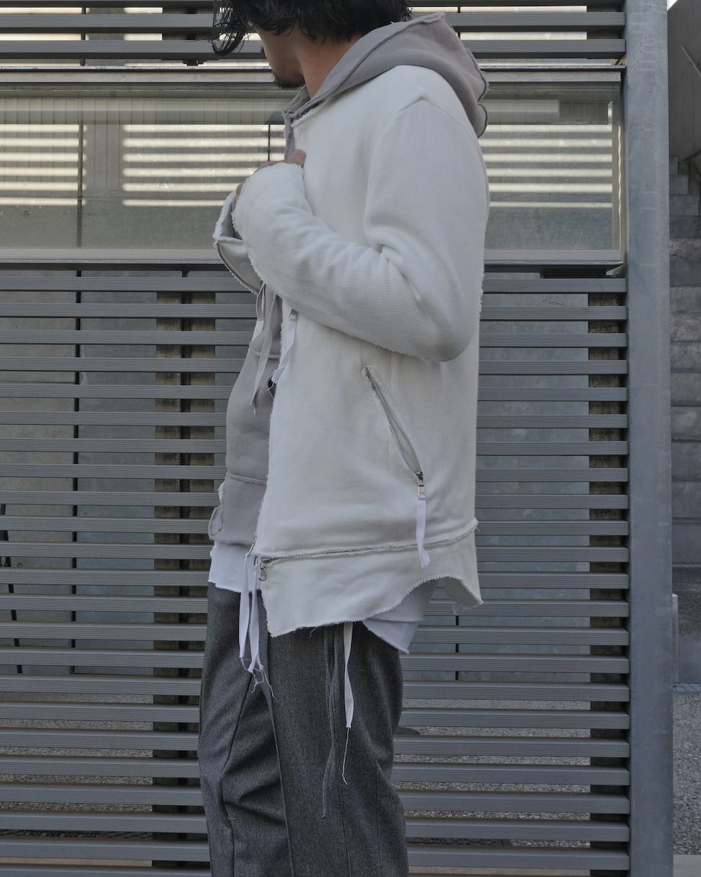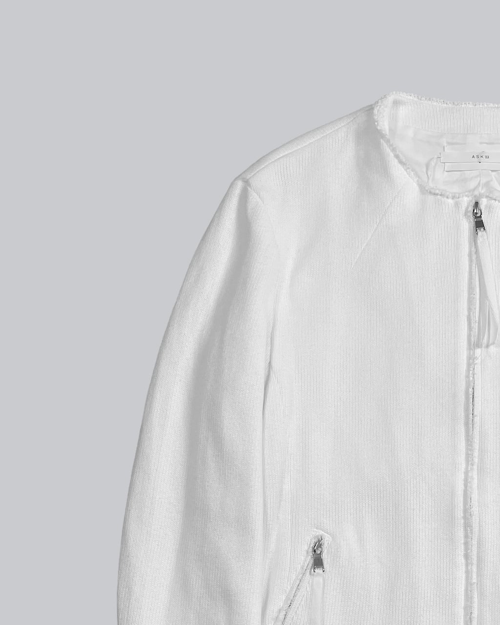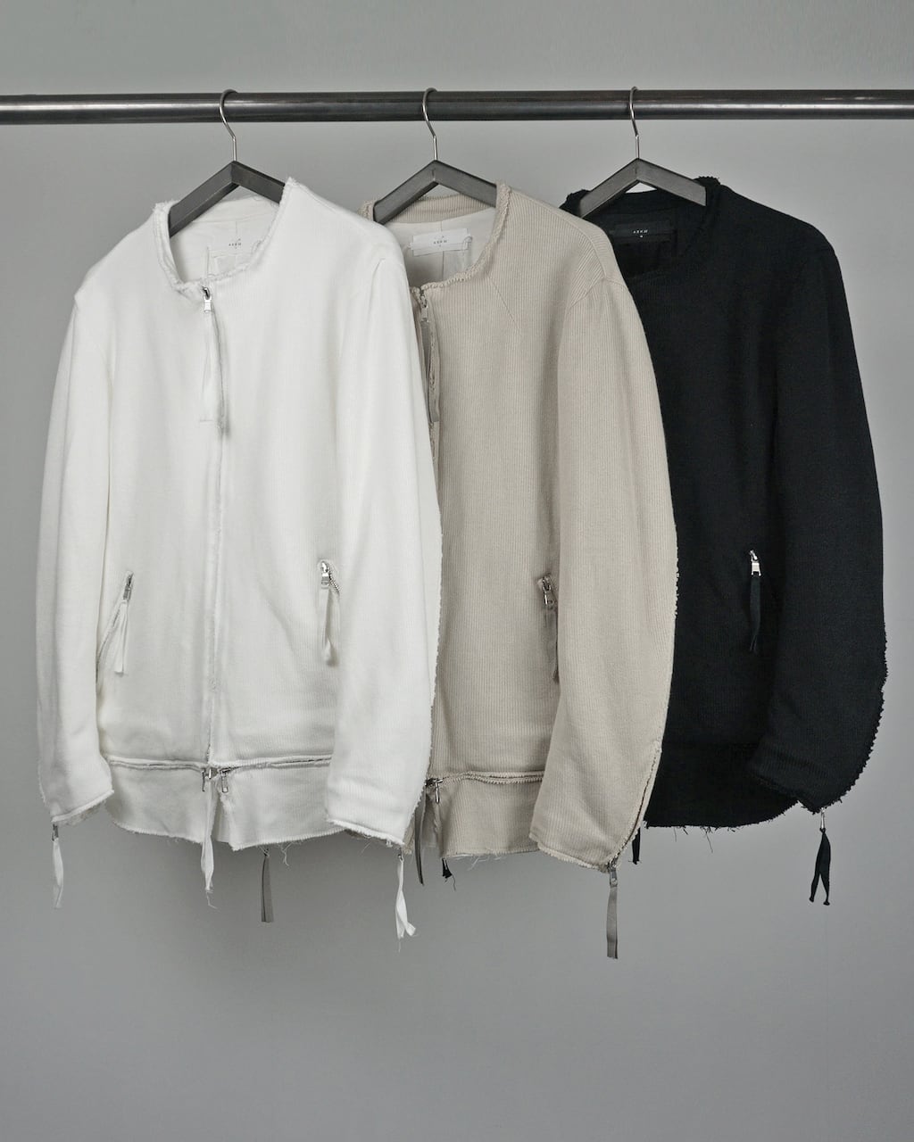 This is a removable hem part riders jacket. It allows for silhouette adjustments through attachment and detachment. Additionally, the use of knitted material softens the rugged vibe of a traditional riders jacket, giving it a more relaxed impression. It features a slightly raised collar, a natural-shaped waist, slit pockets, sleeve zippers, and meticulous attention to silhouette and details, resulting in a timeless and minimalist piece. After sewing, the product undergoes a washing process to achieve an aged appearance, adding a worn-in feel.
