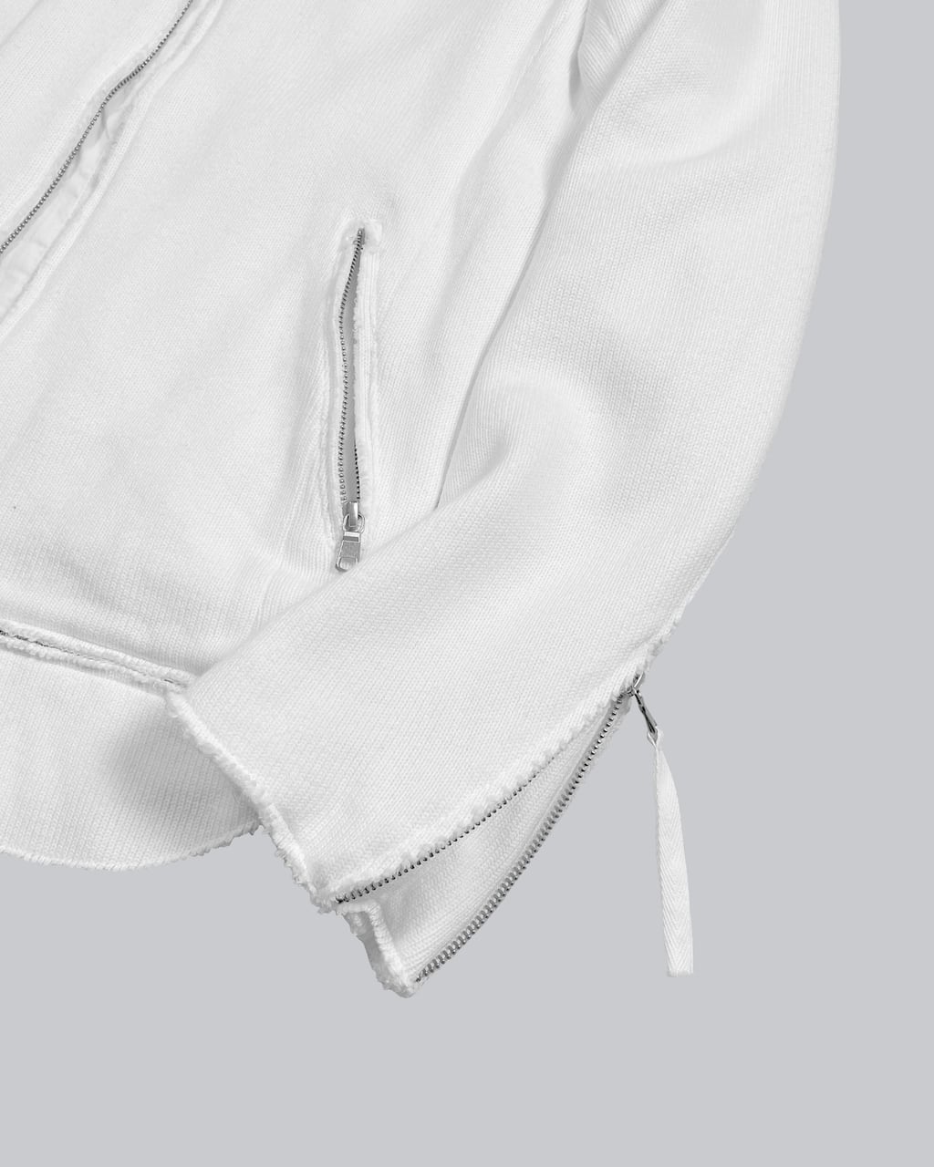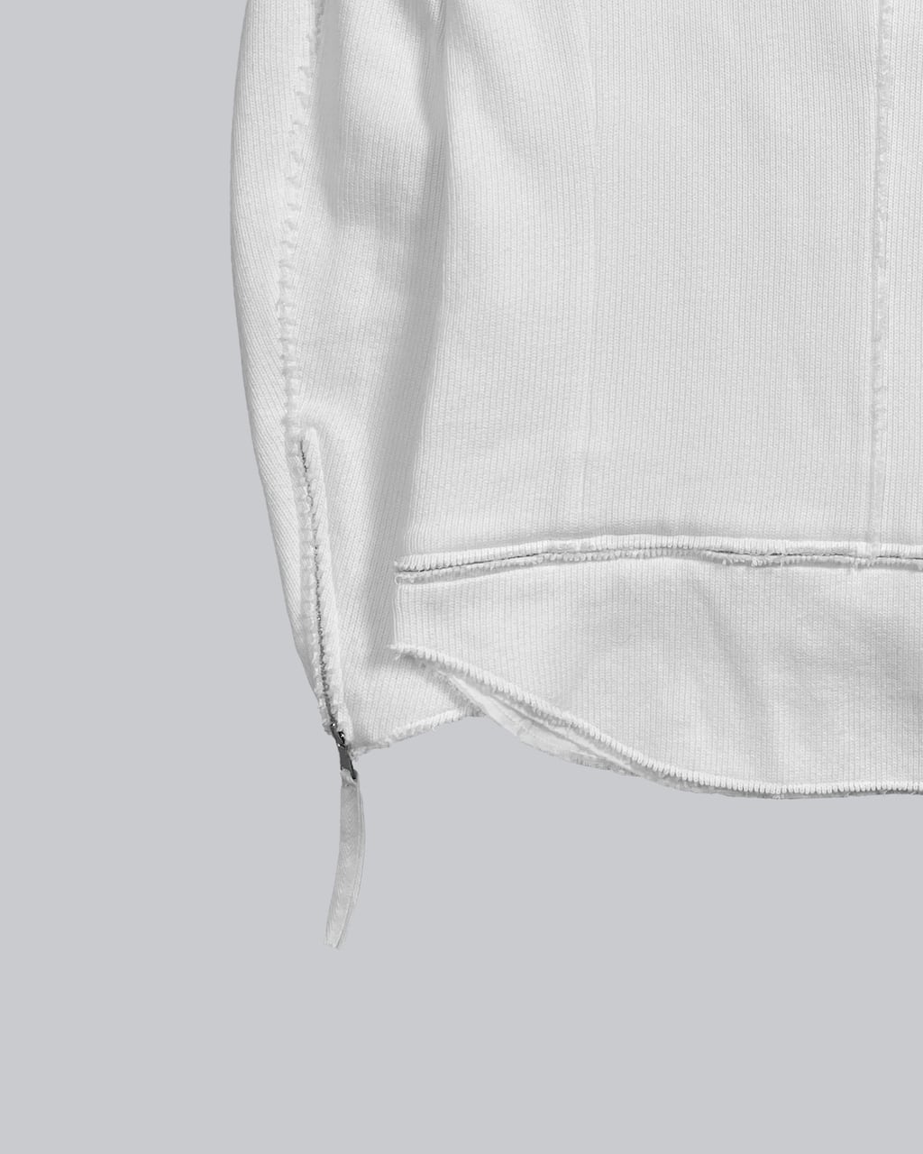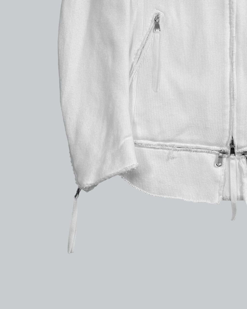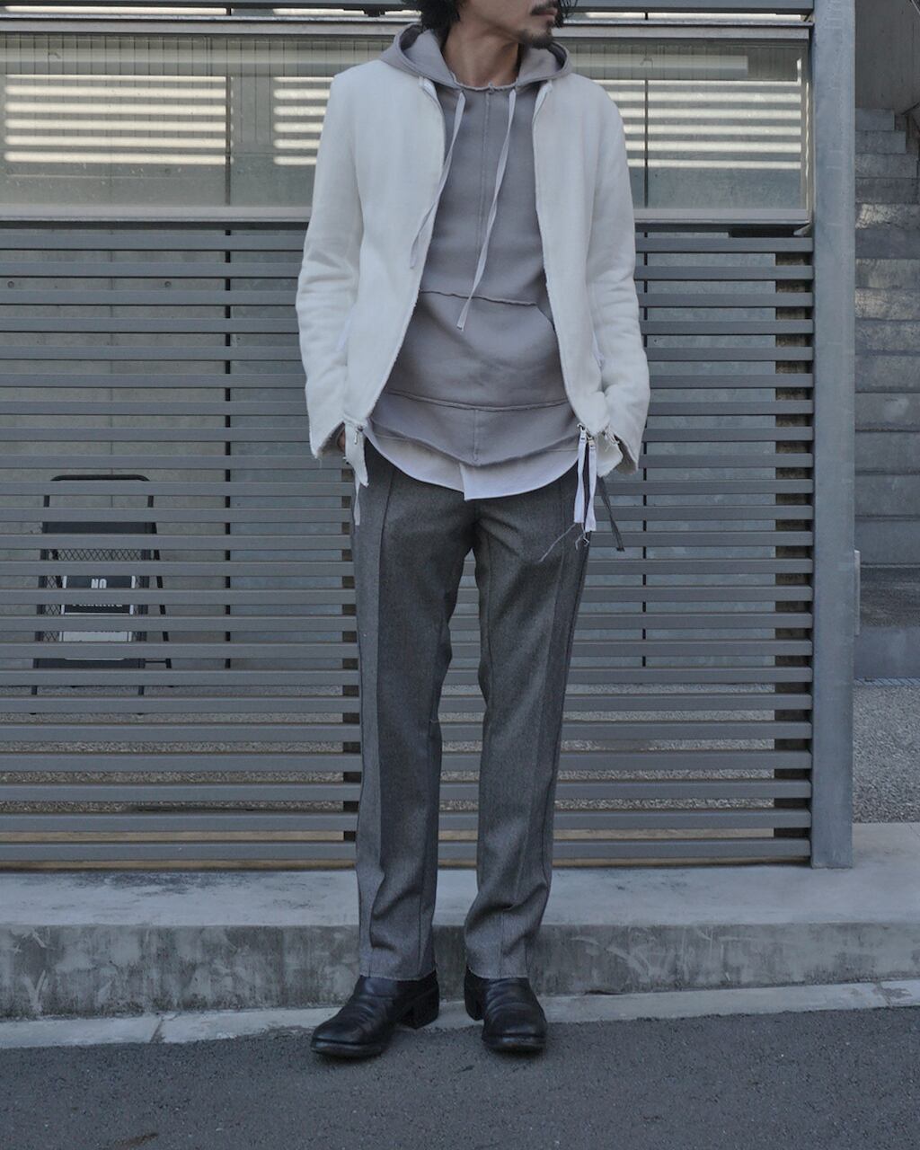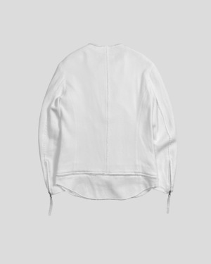 This is a removable hem part riders jacket. It allows for silhouette adjustments through attachment and detachment. Additionally, the use of knitted material softens the rugged vibe of a traditional riders jacket, giving it a more relaxed impression. It features a slightly raised collar, a natural-shaped waist, slit pockets, sleeve zippers, and meticulous attention to silhouette and details, resulting in a timeless and minimalist piece. After sewing, the product undergoes a washing process to achieve an aged appearance, adding a worn-in feel.
