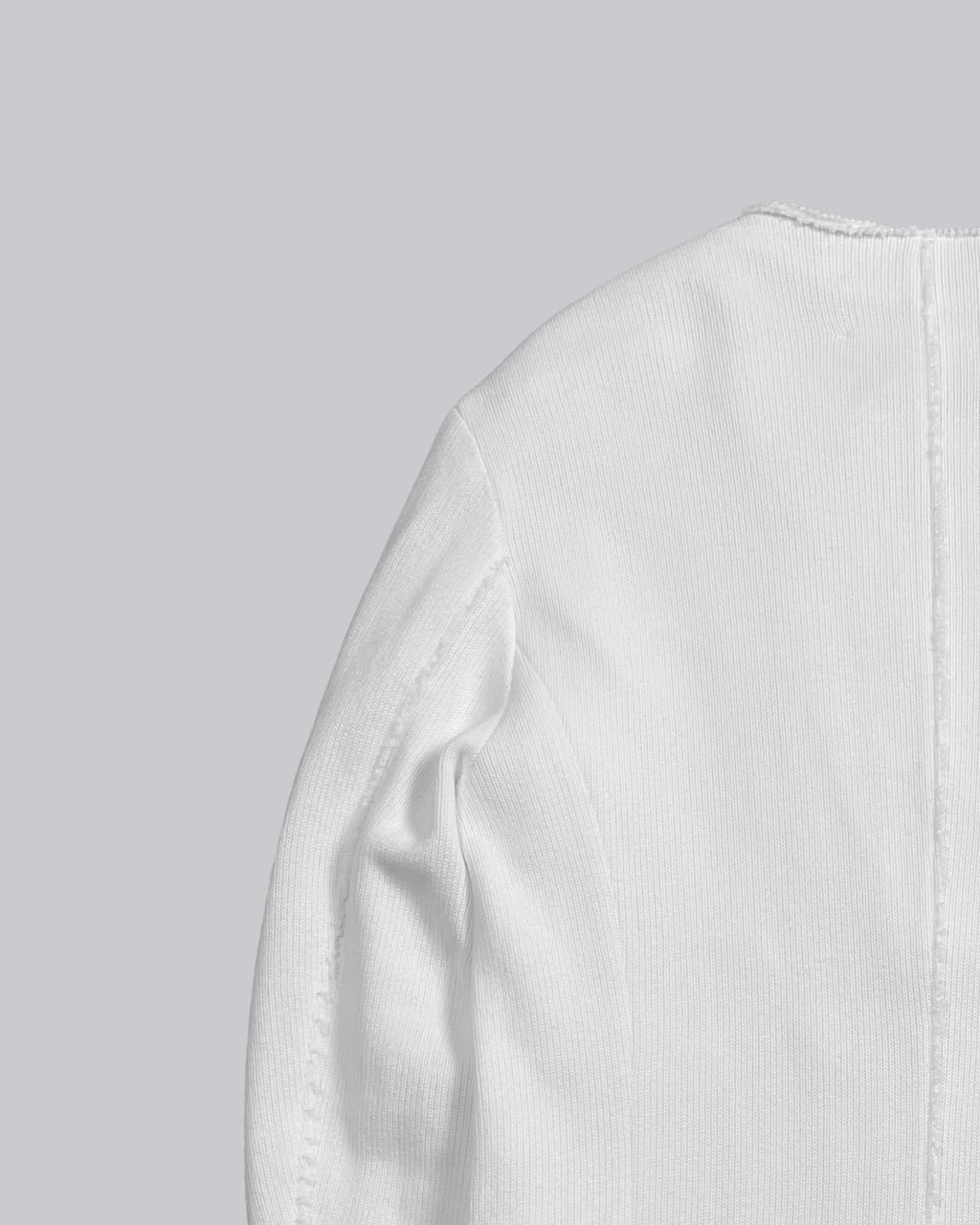 裾部分のパーツが取り外し可能なライダースジャケット。着脱によってシルエットのアレンジを可能とする。また、素材をニットにすることでライダースの硬派な雰囲気をやわらげ、力の抜けた印象を付与。やや立ち上がりのあるノーカラー、自然なシェイプのウエスト、スリットポケット、袖のジップなどシルエットや細部にこだわり、普遍的でミニマルな1着へ仕上げた。