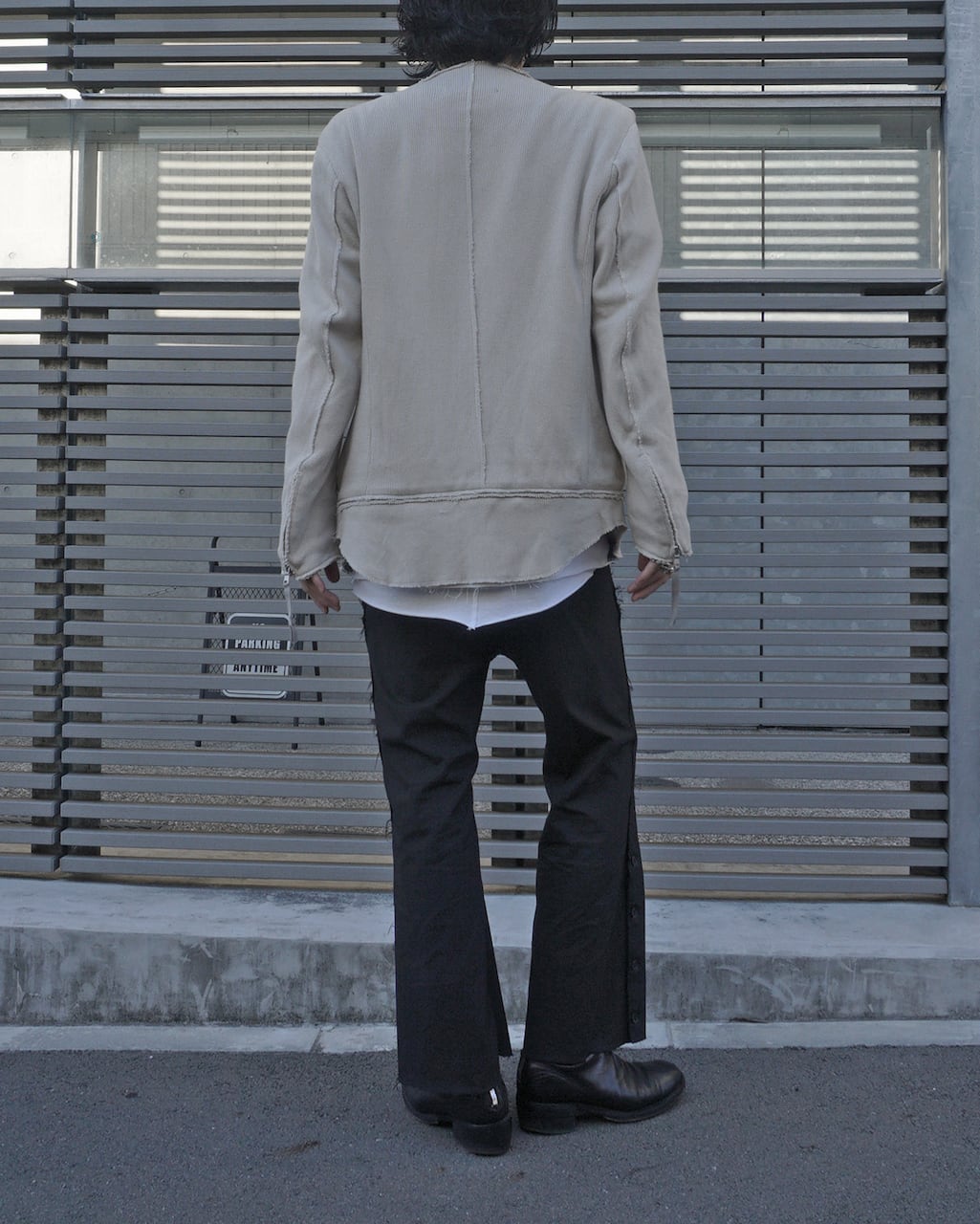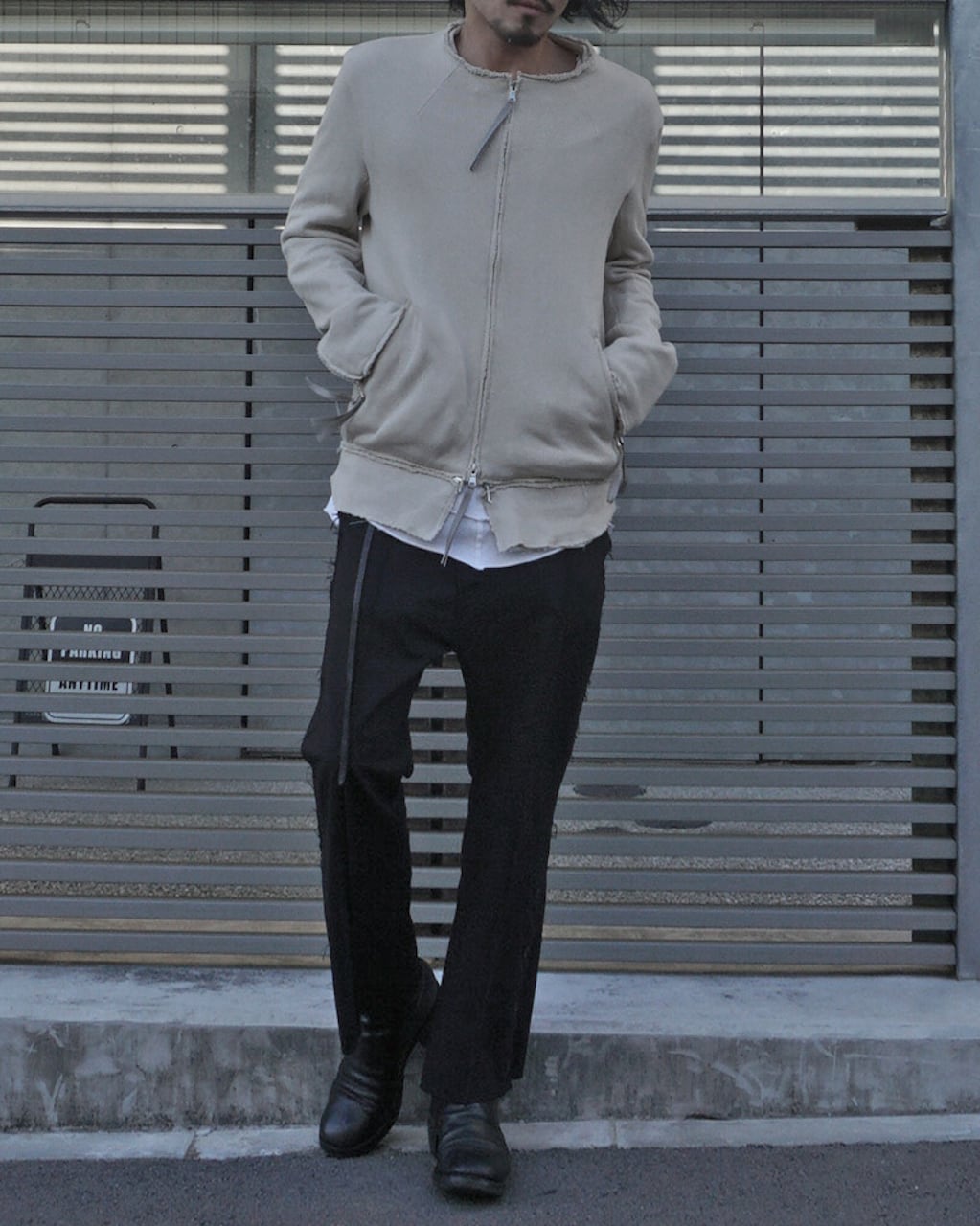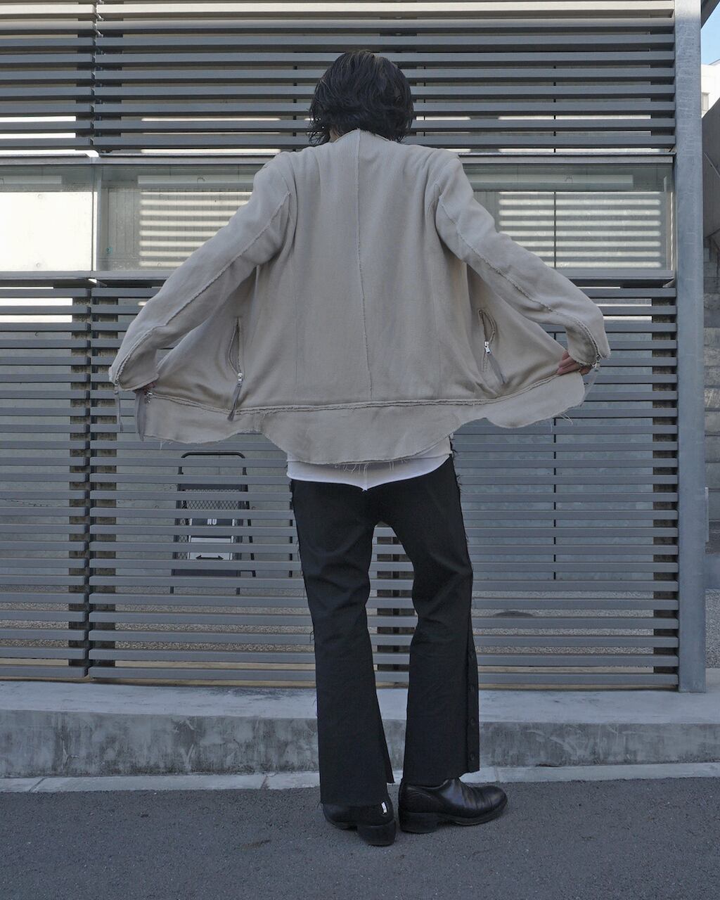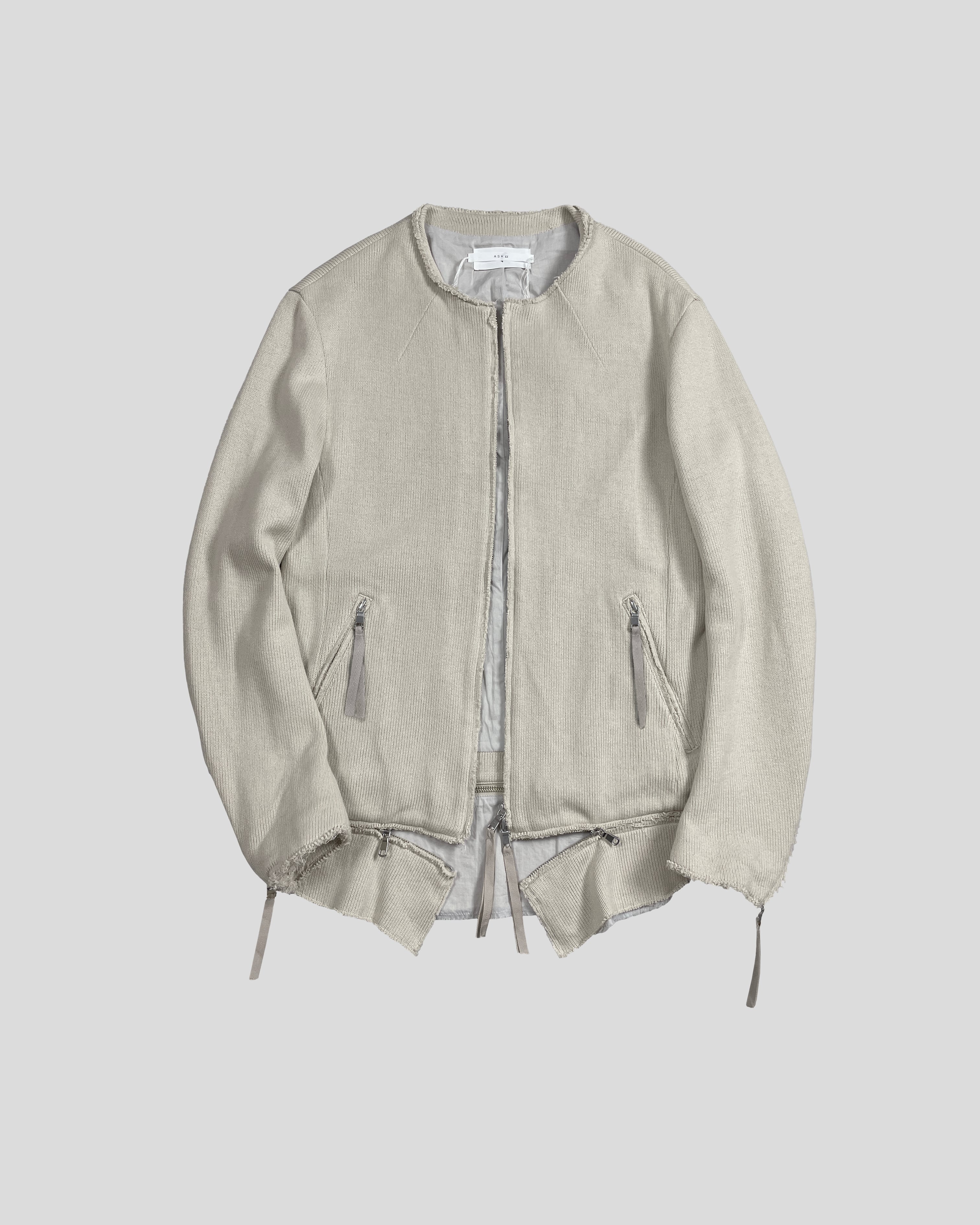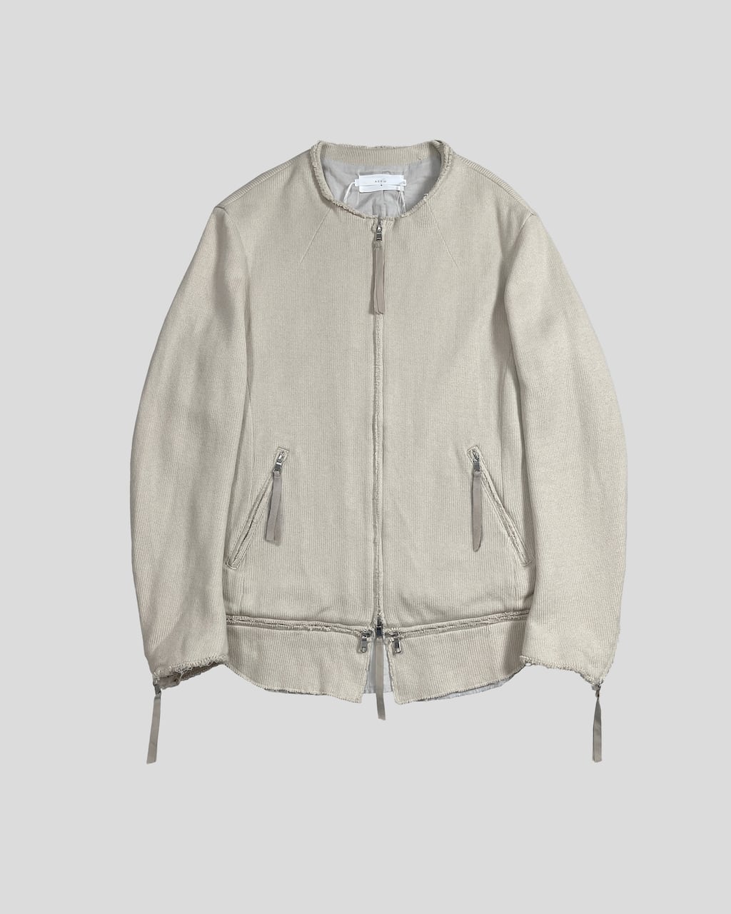 This is a removable hem part riders jacket. It allows for silhouette adjustments through attachment and detachment. Additionally, the use of knitted material softens the rugged vibe of a traditional riders jacket, giving it a more relaxed impression. It features a slightly raised collar, a natural-shaped waist, slit pockets, sleeve zippers, and meticulous attention to silhouette and details, resulting in a timeless and minimalist piece. After sewing, the product undergoes a washing process to achieve an aged appearance, adding a worn-in feel.
