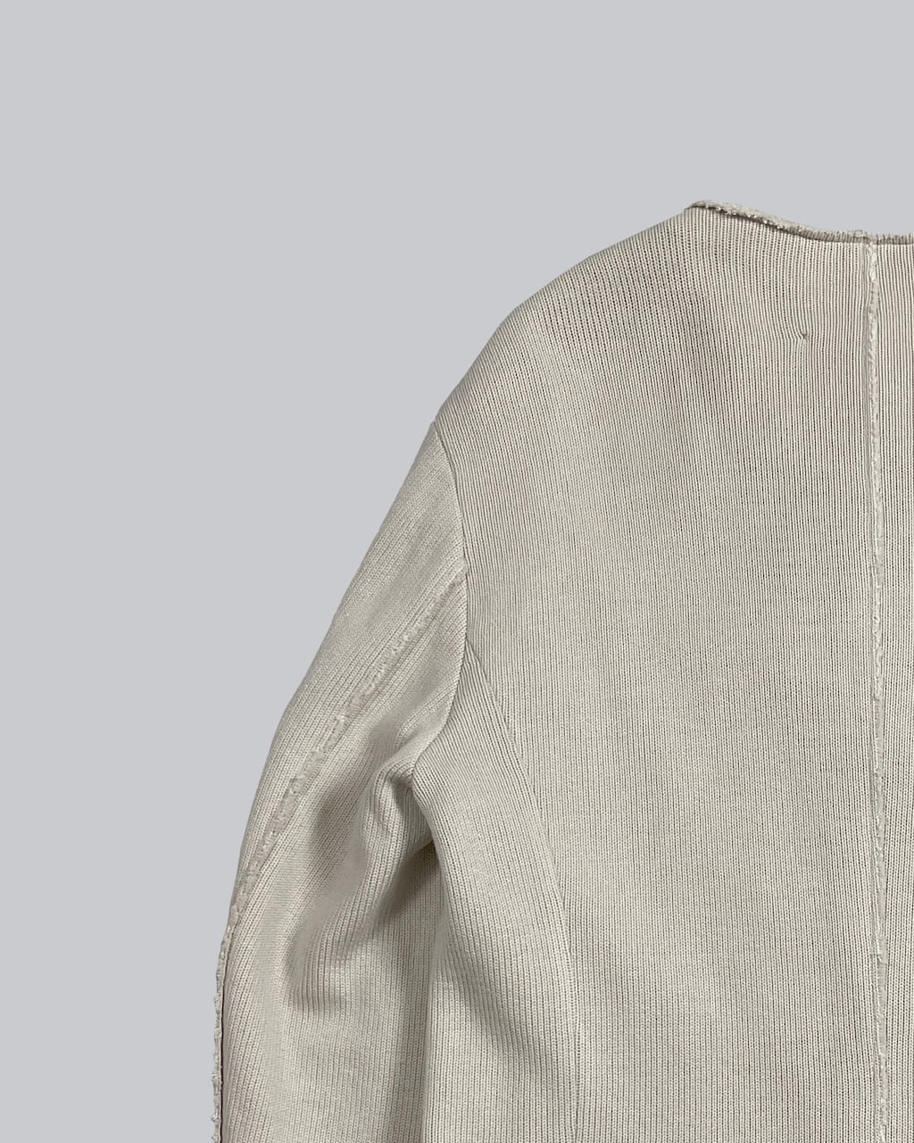 裾部分のパーツが取り外し可能なライダースジャケット。着脱によってシルエットのアレンジを可能とする。また、素材をニットにすることでライダースの硬派な雰囲気をやわらげ、力の抜けた印象を付与。やや立ち上がりのあるノーカラー、自然なシェイプのウエスト、スリットポケット、袖のジップなどシルエットや細部にこだわり、普遍的でミニマルな1着へ仕上げた。