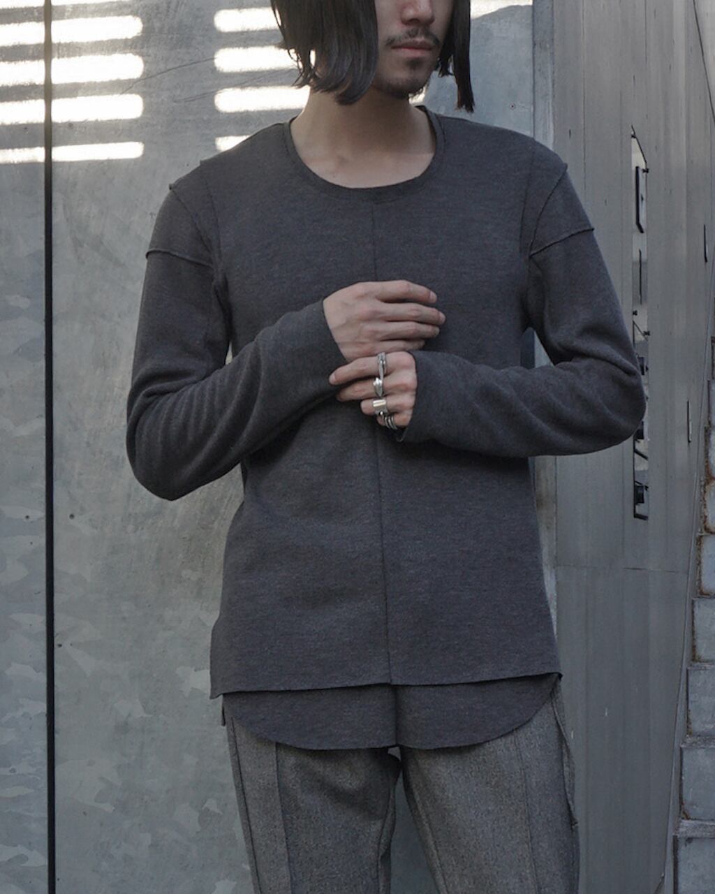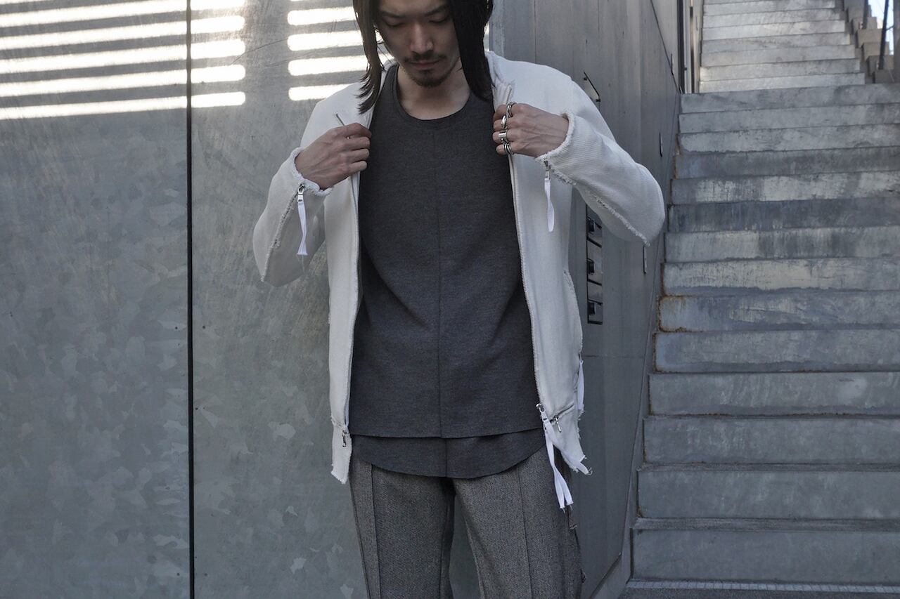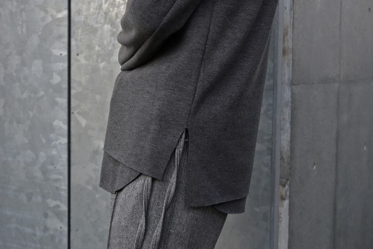 首元は詰まりがなく、リラックスしたニュアンス。ベストはニットベスト単体としても使いやすいようシンプルでミニマルな作りに対し、本体の長袖部分は肩線を2つ設けるASKYY定番のデザインをプラス。デザイン性、利便性、防寒性、価格など総合的にバランスのとれた作品が完成した。