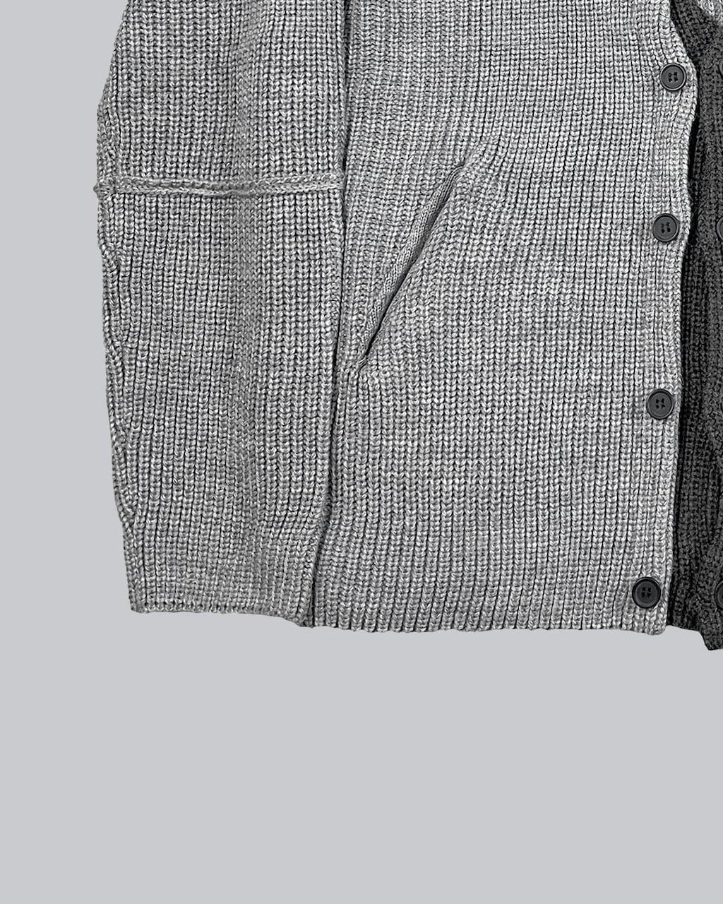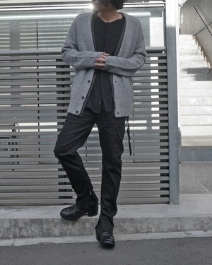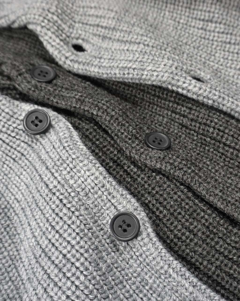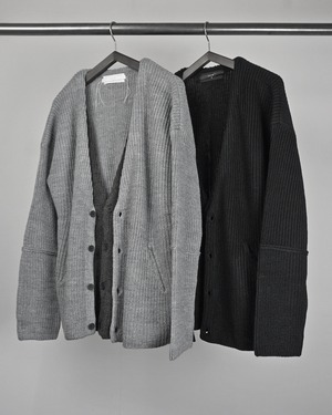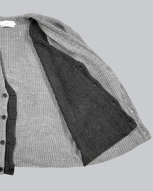 身頃を2枚仕立てとしフロントのレイヤーがアクセントとになったニットアウター。単調になりがちなカーディガンにアクセントをもたらし、コートのフロントを開けた状態でも2枚仕立ての分、インナーとして快適な暖かさを保つ。充分な厚みがあるローゲージの編み立てでざっくりラフな印象をつくり、シルエットもドロップショルダーでリラックスムード漂う一品。シンプルだからこそ細部にこだわり普遍的なデザインに落とし込んだ。