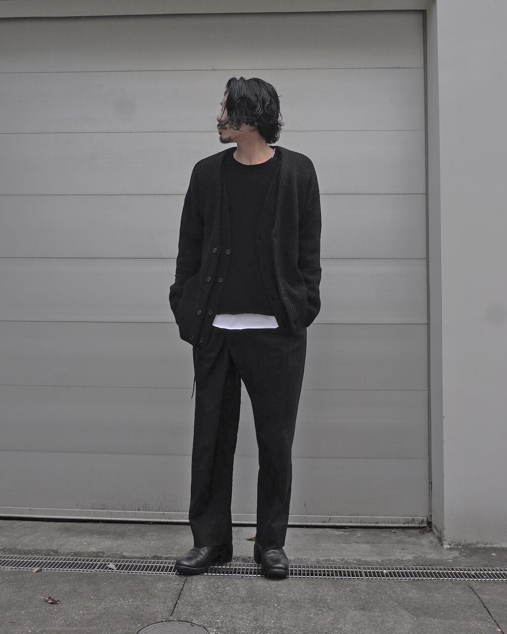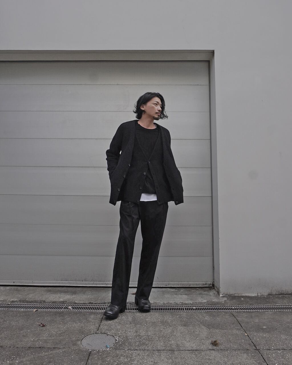 The front body is a double-layered layered style. This design ensures comfortable warmth as an inner layer even when the coat's front is open. The loose gauge knitting with sufficient thickness creates a rugged and casual impression, and the silhouette exudes a relaxed mood with drop shoulders.
