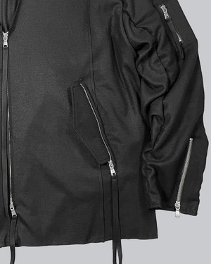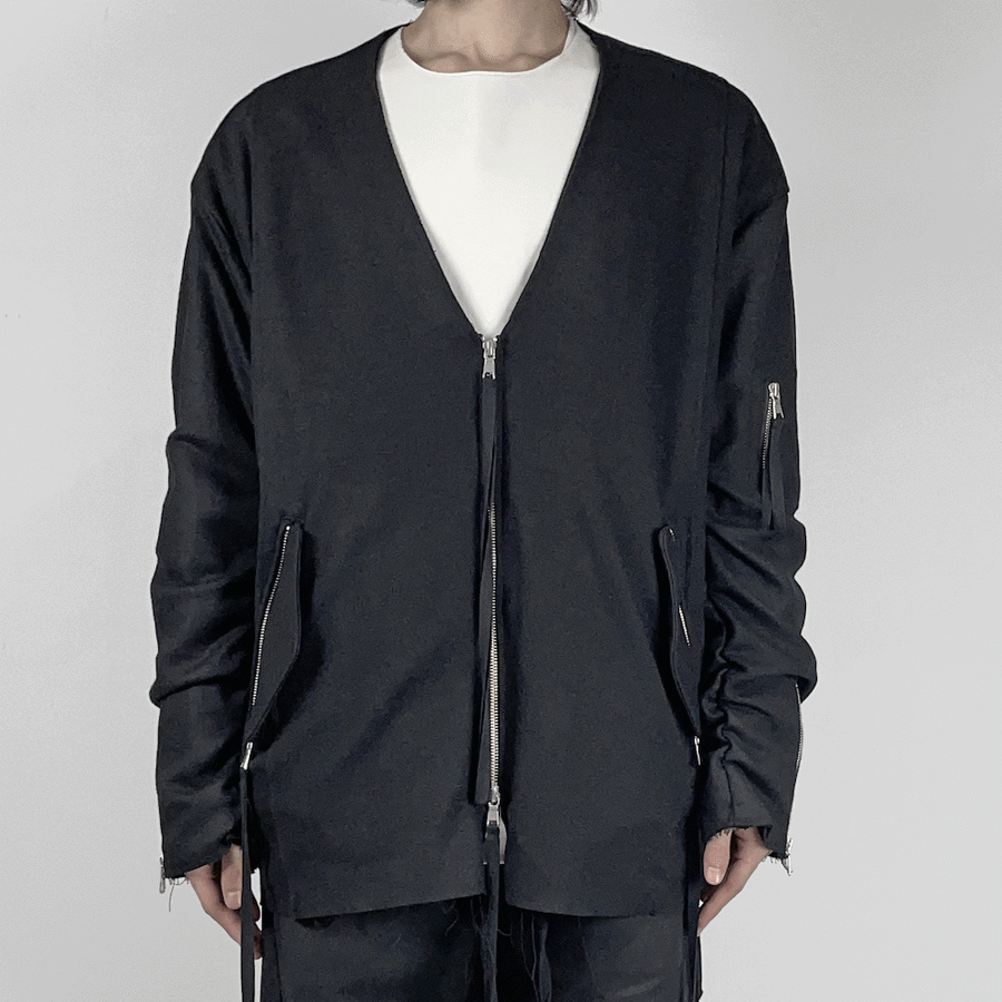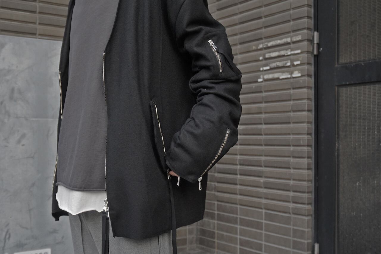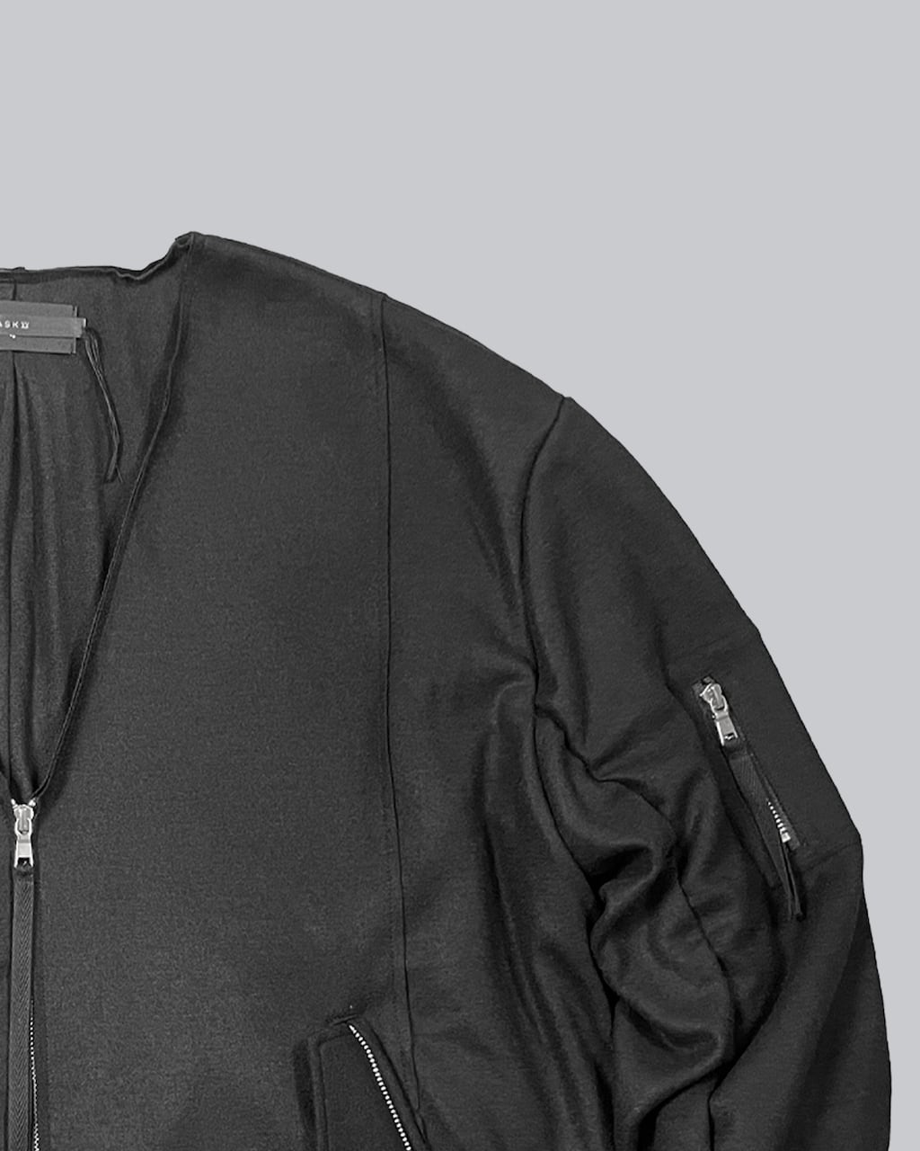 カーディガンのフォルムのまま気軽に着用出来るボンバージャケット。Vネック型のフロントとリラックスしたサイジングはカーディガンのもつラフなニュアンスを持ち合わせ、細部にミリタリー要素を組み込んだ1着。特徴的な腕周りはギャザーを入れることでシワと溜まりが出来ており、立体感のある仕上がり。ファスナーの先端についた長いドローコード、袖口のジップ、収納可能なフラップポケットなど無骨な印象を併せ持つ。また、裏地をニットにすることで保温性を向上。