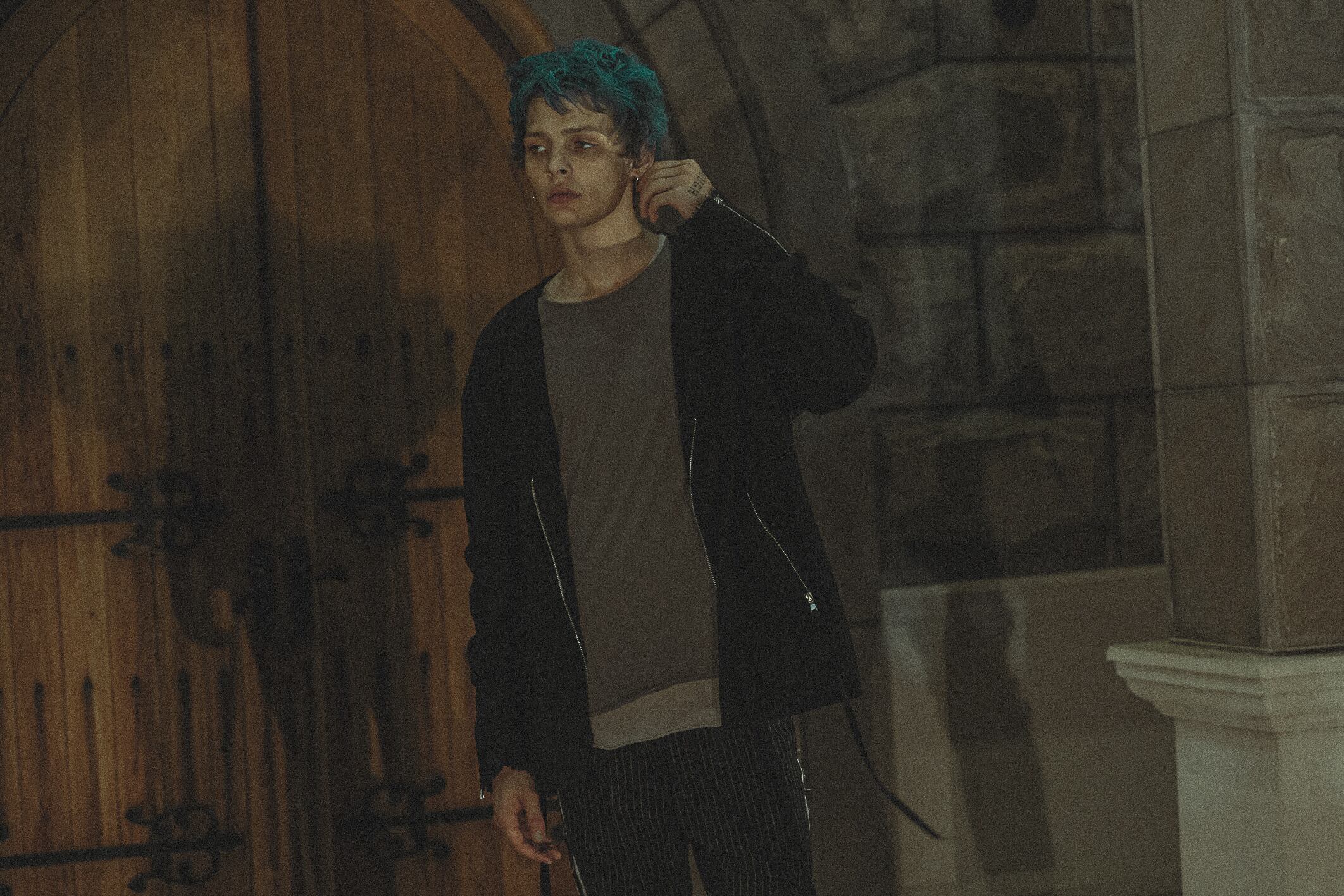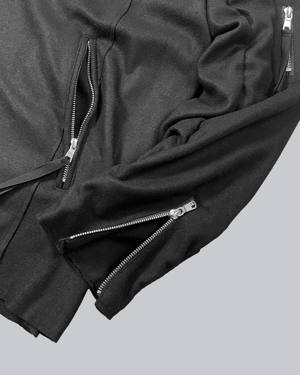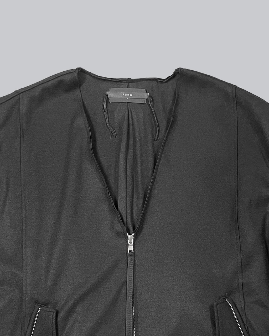 カーディガンのフォルムのまま気軽に着用出来るボンバージャケット。Vネック型のフロントとリラックスしたサイジングはカーディガンのもつラフなニュアンスを持ち合わせ、細部にミリタリー要素を組み込んだ1着。特徴的な腕周りはギャザーを入れることでシワと溜まりが出来ており、立体感のある仕上がり。ファスナーの先端についた長いドローコード、袖口のジップ、収納可能なフラップポケットなど無骨な印象を併せ持つ。また、裏地をニットにすることで保温性を向上。