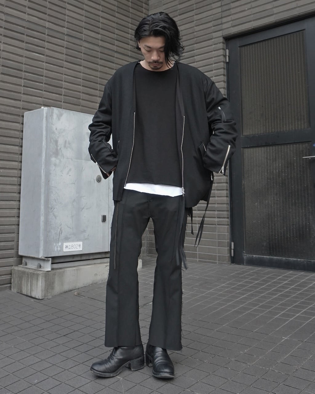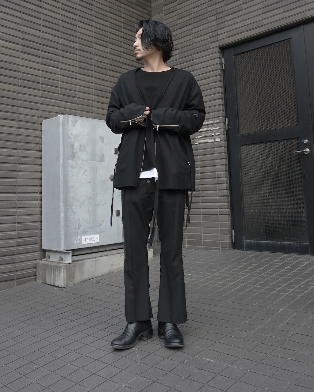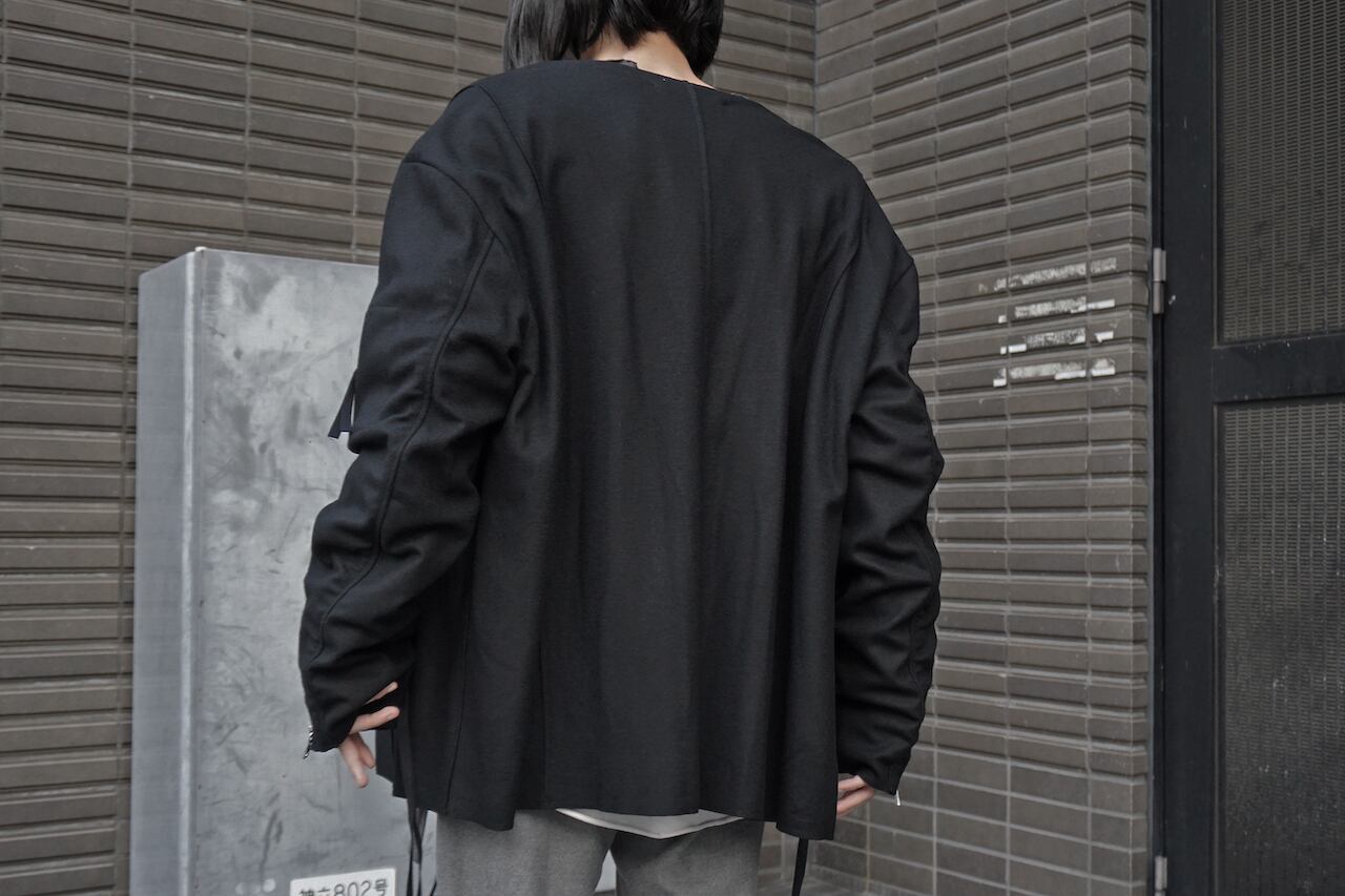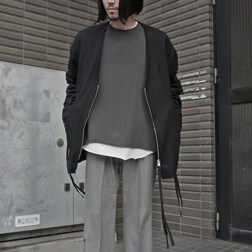 A bomber jacket that can be worn in the form of a cardigan. Its V-shaped front design and relaxed sizing offer a casual vibe similar to a cardigan, while incorporating military elements in the details. The distinctive arm design creates wrinkles and gathers by adding gathers, resulting in a three-dimensional finish.