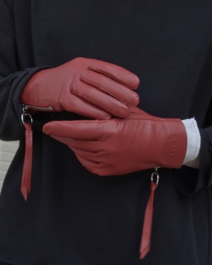 レザーはとても馴染みがよく、着用者の形にフィットする。レザーとのコントラストがさりげないジップの先端には動きを邪魔しない長さのコード。甲部分にはブランドのロゴが刻印。BLKのみ全箇所タッチパネル対応。REDはタッチパネル対応ではありません。