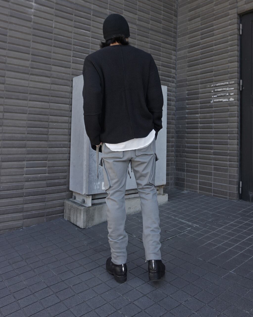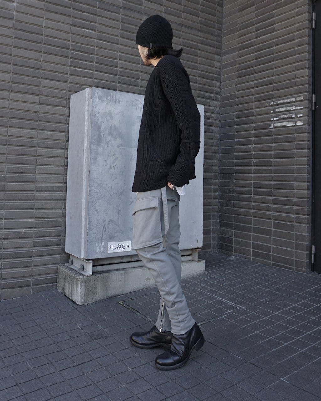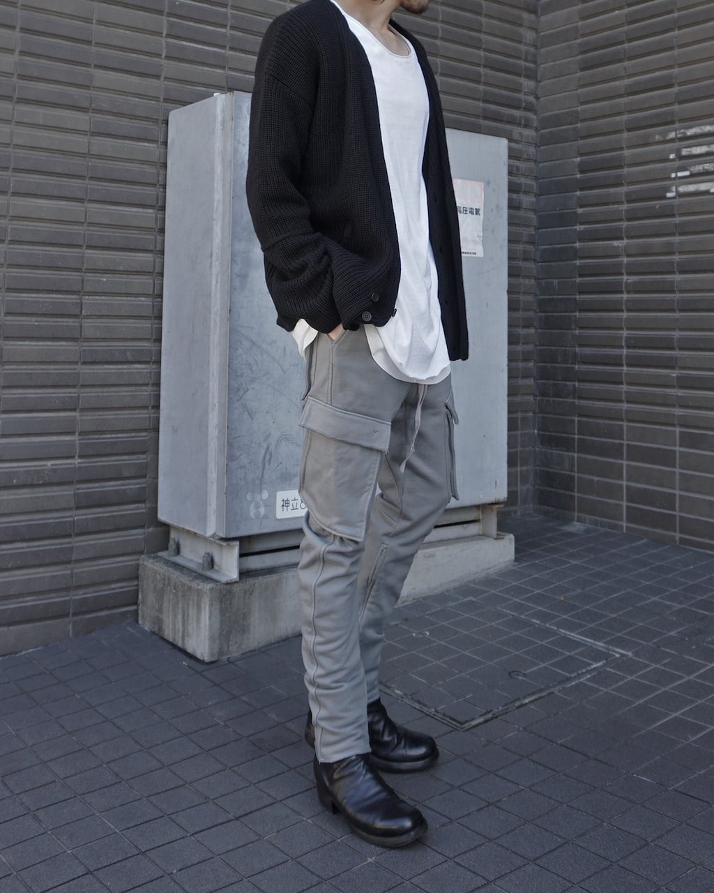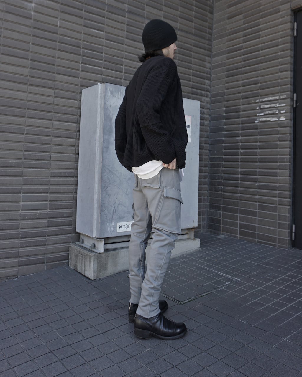 Cargo pants made from sweat fabric that has undergone a product dyeing process to express its unique texture and color tone. Featuring three-dimensional patch pockets and flaps, it exudes a wild impression overall while maintaining a slim silhouette to balance it out. With a slightly deep rise and ample room around the thighs, it is tapered towards the hem but equipped with long zippers, allowing for transformation into a flare silhouette. A new icon strap is attached to the left pocket, while discreet Y embroidery adorns the flap of the right pocket. While remaining a universal cargo pants style, attention to detail, color, and material sets it apart, aiming for differentiation.
