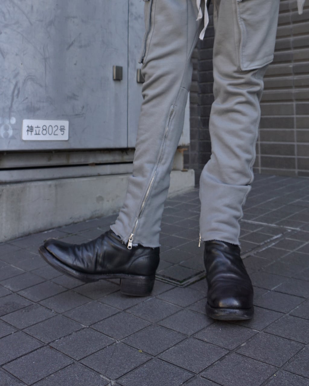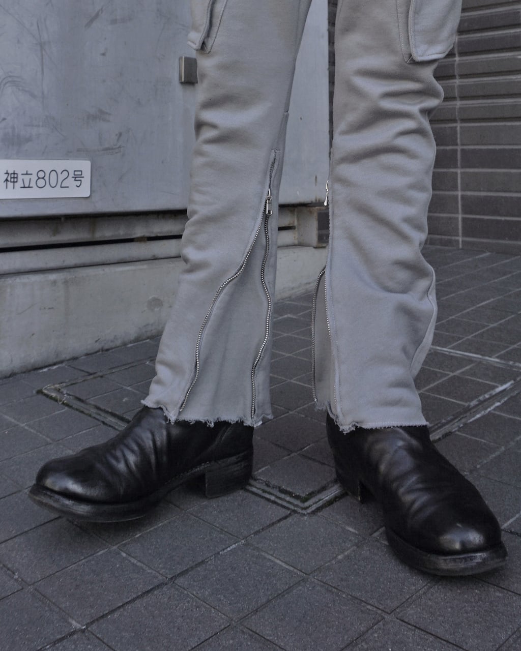 裏毛特有のへたりを抑え強度の高いハリをもたせたヘビージャージ。足の形を拾いすぎず綺麗なシルエットを実現。縫製後に染色加工を施しクラフト感とグランジ感を加えている。生地が強い分長くご着用可能で、染め落ち感などを踏まえ経年変化も見込める一品。