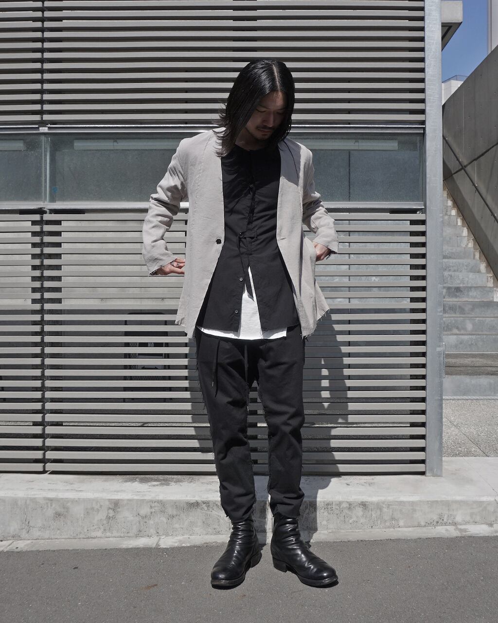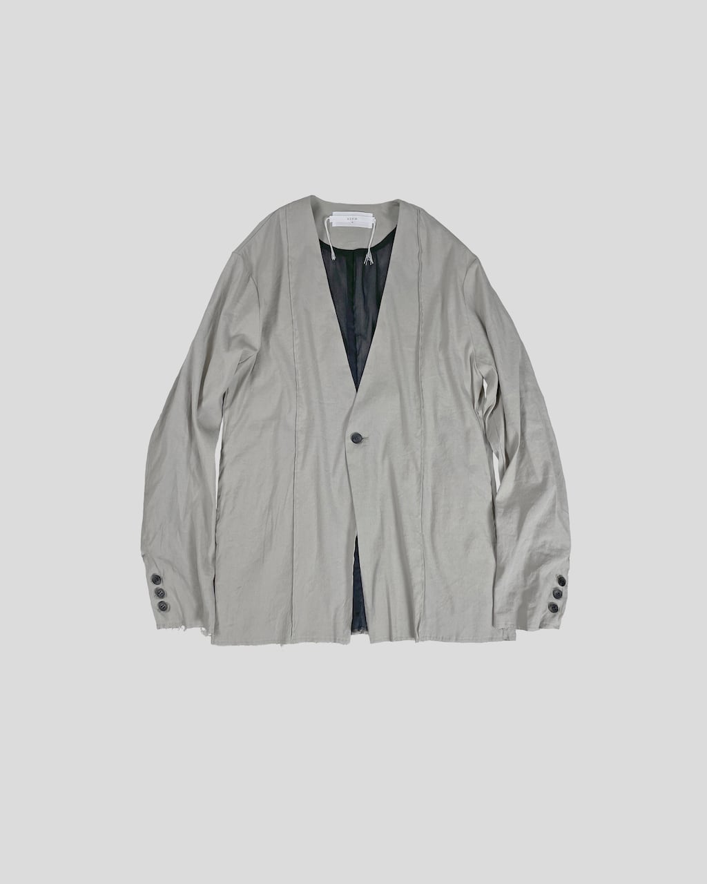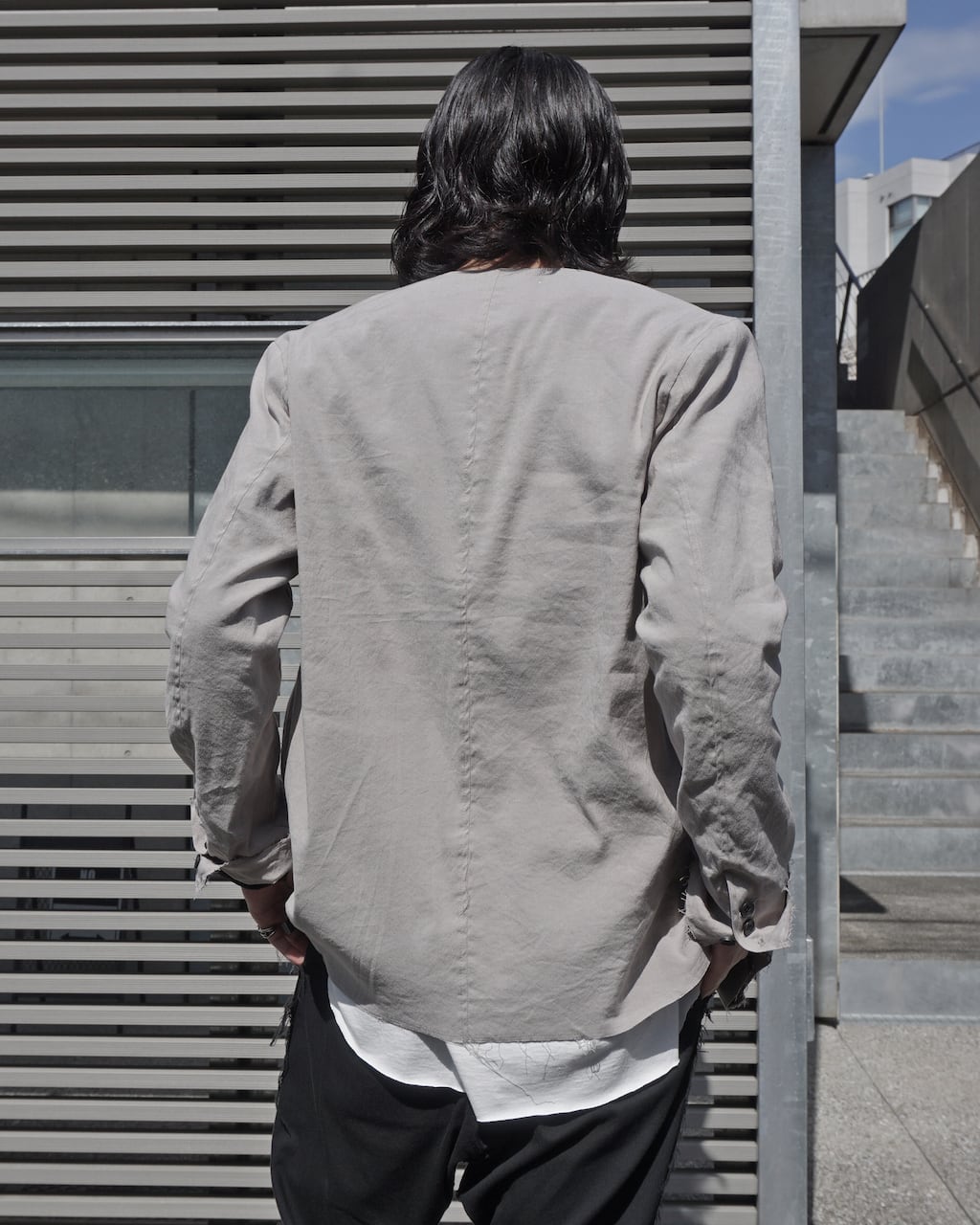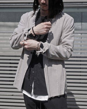 A collarless jacket crafted with high-quality stretch linen. Characterized by vertical pintucks and designed with minimal embellishments to ensure longevity in wear. Featuring three buttons at the cuffs and slit pockets at the waist. This marks ASKYY's first use of linen material, acquiring a crafty and relaxed feel previously unattainable. By cutting only the hem, we've balanced the formal and grunge elements, creating a versatile jacket suitable for casual, modern, and even business occasions.
