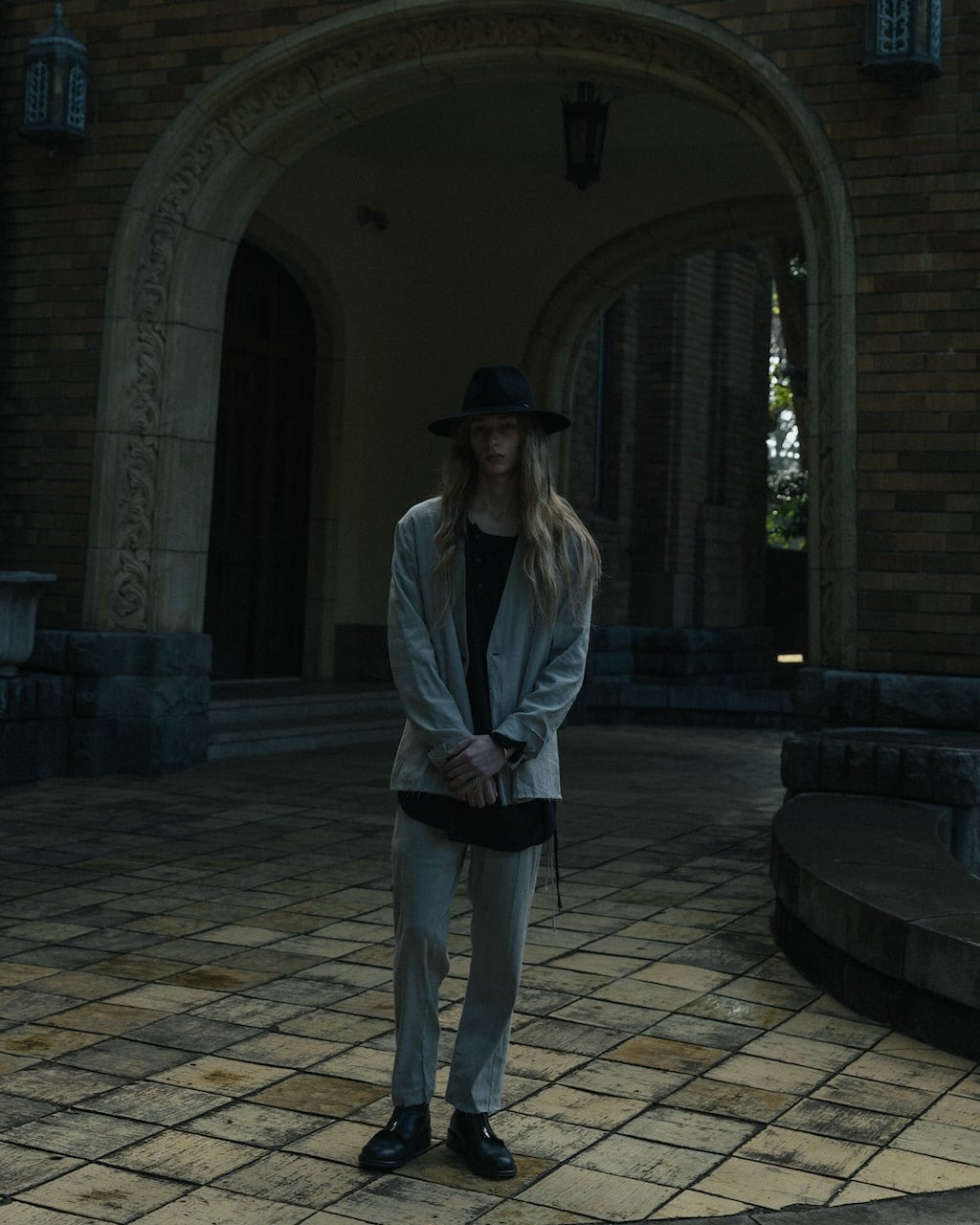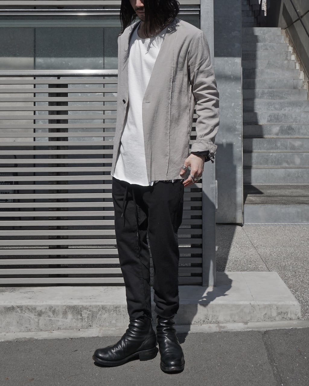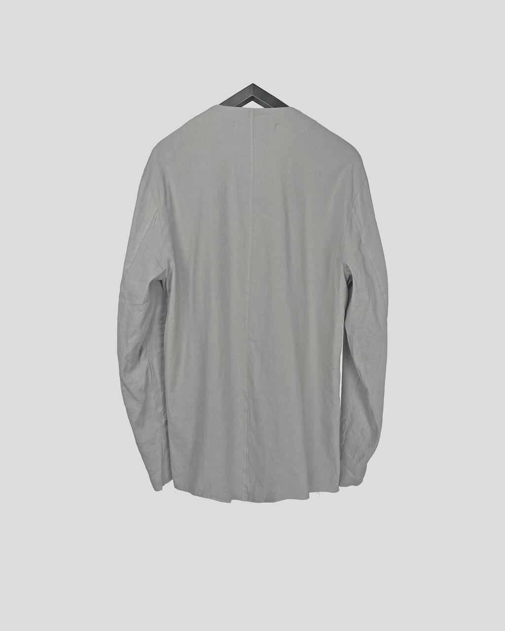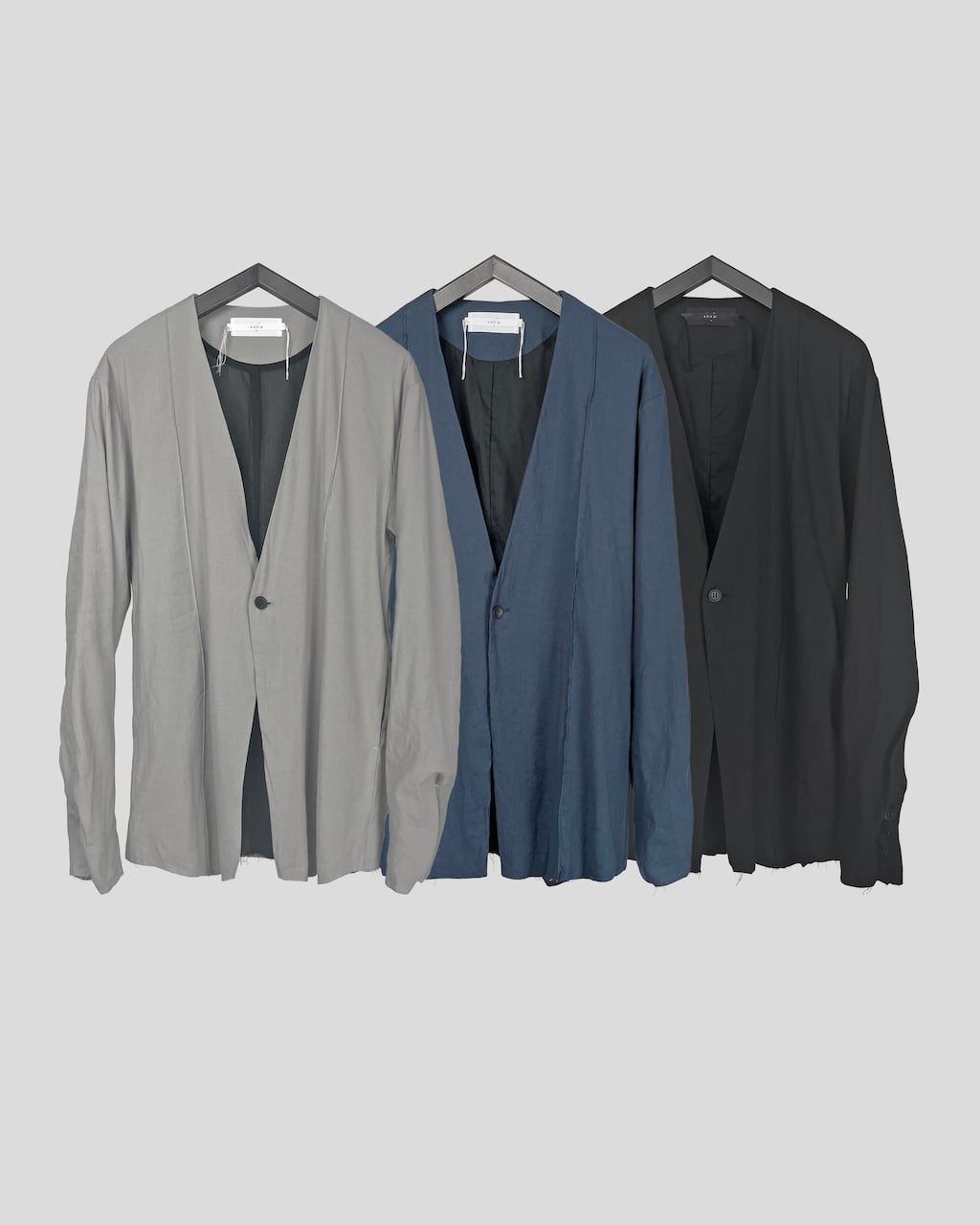 A collarless jacket crafted with high-quality stretch linen. Characterized by vertical pintucks and designed with minimal embellishments to ensure longevity in wear. Featuring three buttons at the cuffs and slit pockets at the waist. This marks ASKYY's first use of linen material, acquiring a crafty and relaxed feel previously unattainable. By cutting only the hem, we've balanced the formal and grunge elements, creating a versatile jacket suitable for casual, modern, and even business occasions.