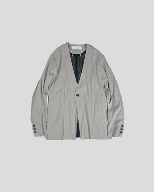 高品質のストレッチリネンを用いたノーカラージャケット。縦に入るピンタックが特徴で、その他の過度な装飾を控えることで長くご愛用頂けるミニマルなデザインに仕上げた。袖口には3つボタン、腰にはスリットポケット。
