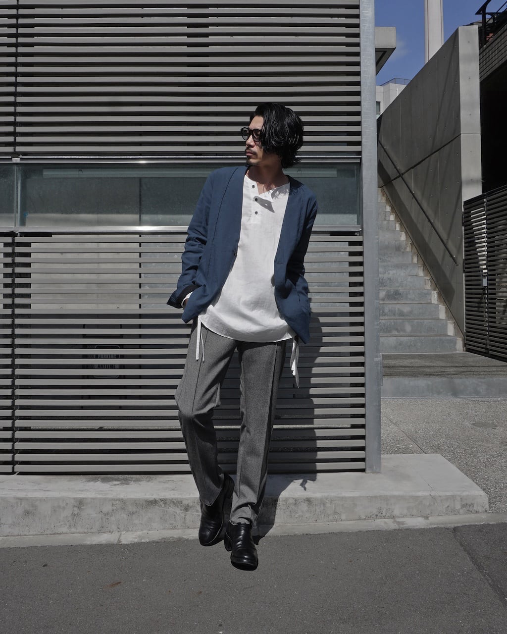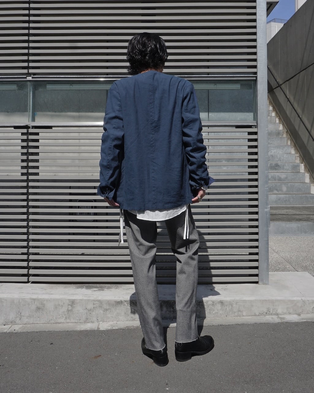 A collarless jacket crafted with high-quality stretch linen. Characterized by vertical pintucks and designed with minimal embellishments to ensure longevity in wear. Featuring three buttons at the cuffs and slit pockets at the waist. This marks ASKYY's first use of linen material, acquiring a crafty and relaxed feel previously unattainable. By cutting only the hem, we've balanced the formal and grunge elements, creating a versatile jacket suitable for casual, modern, and even business occasions.