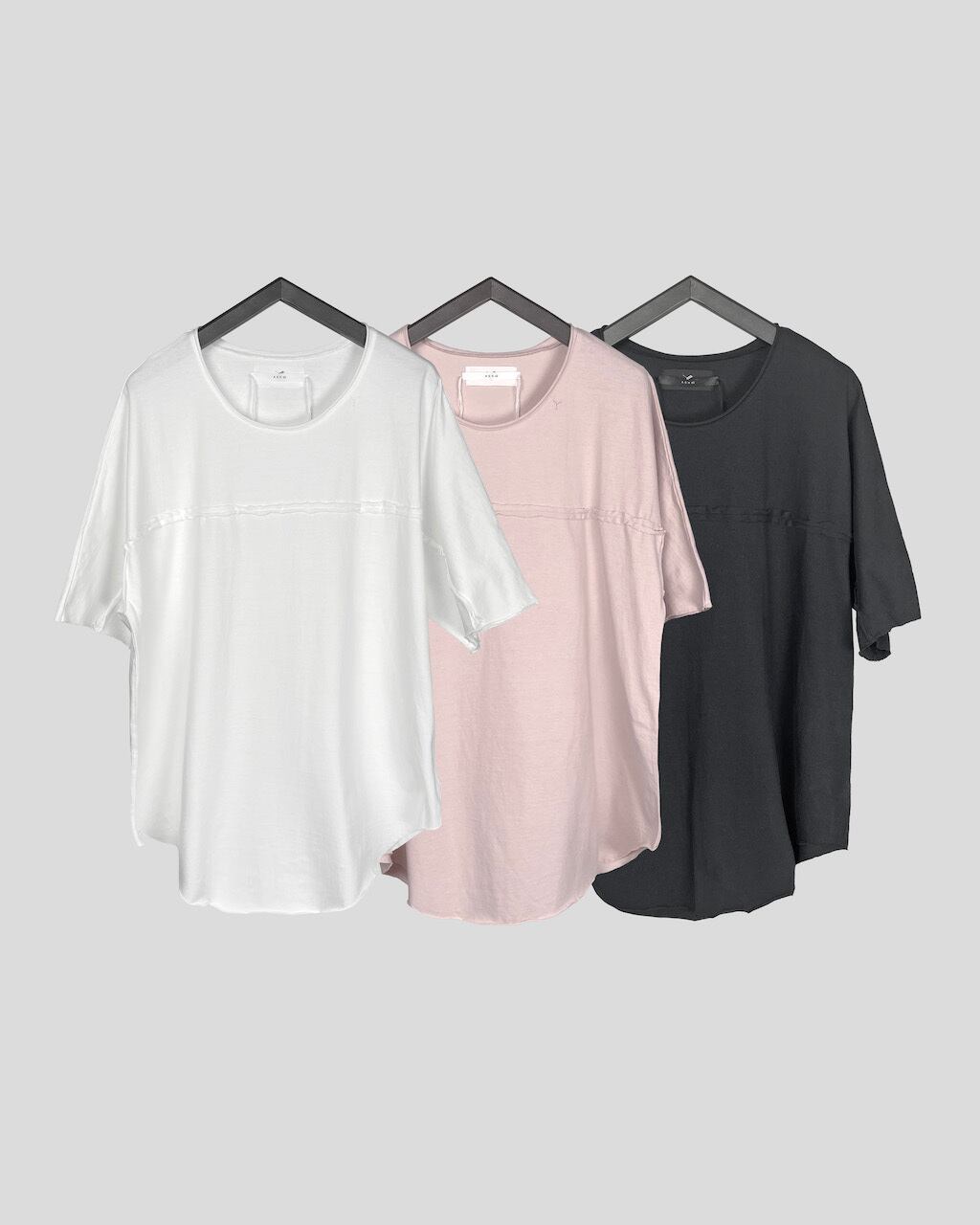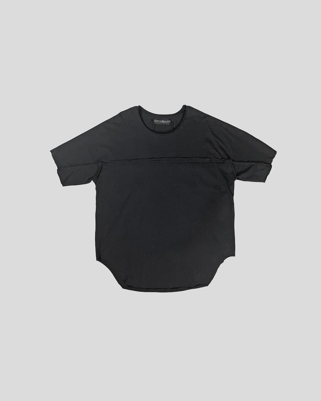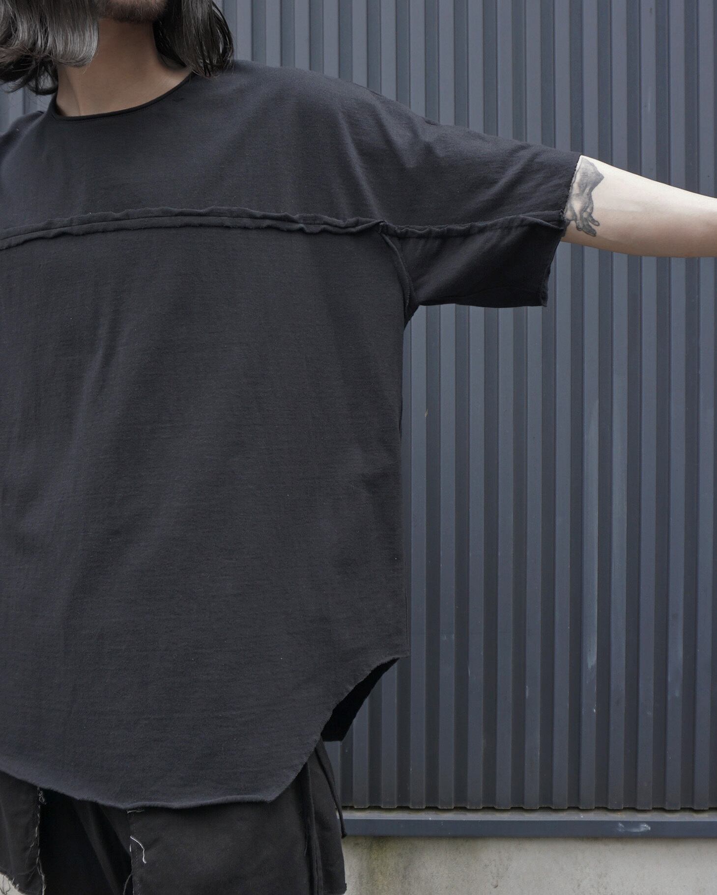 A "non-see-through" cut-and-sew made with heavyweight material. It's highly durable, and its tough material allows for worry-free wear even during repeated washing in the summer. By eliminating the shoulder line and creating a design similar to dolman sleeves, it naturally fits each body type. Finished with a new pattern that dispels concerns about oversized fits, it becomes a timeless piece unaffected by trends.