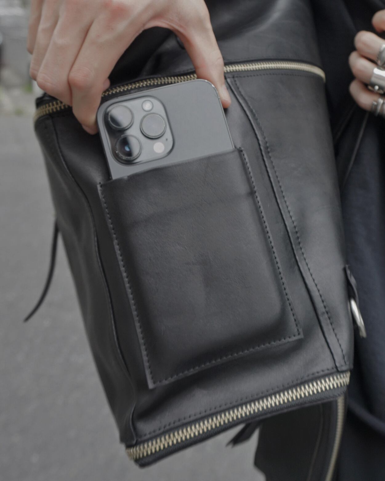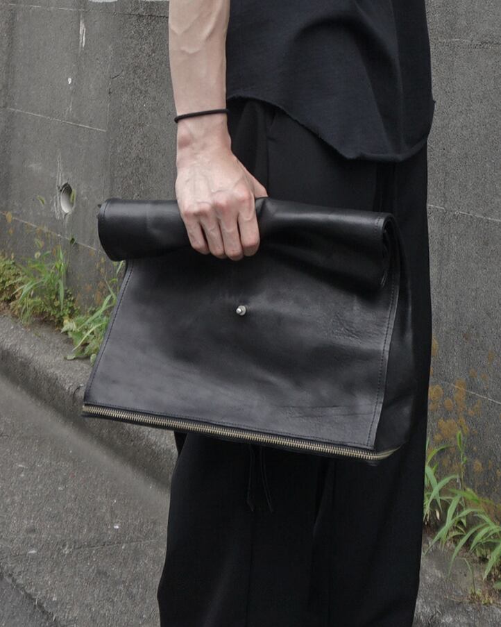 The size is suitable for everything from work to a few days of travel. Even in clutch mode, it is large enough to hold a laptop. There are pockets on the sides for storing smartphones or card cases. The straps are adjustable in length. All silver parts have been aged through a fuming process. The central strap is engraved with the ASKYY logo. This backpack is carefully handcrafted by Japanese artisans.