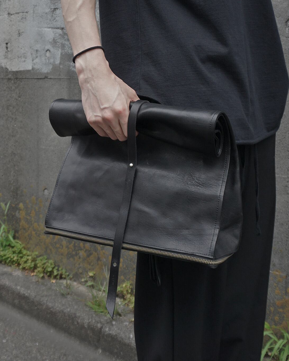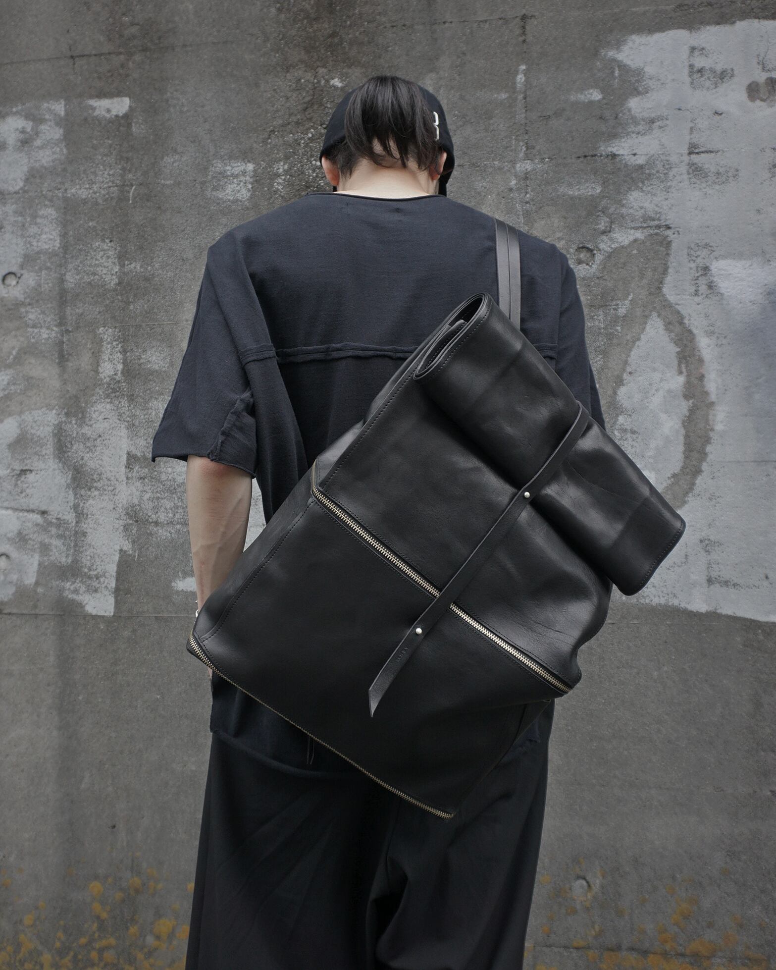 背中のストラップはバックパックorショルダーバックのいずれかで選択可能。物を収納する時は上部を丸めストラップで固定。面倒な場合や急ぎの場合は背中側についたダブルジップを開けダイレクトに収納も可能。これに伴って機能性、防犯性をも向上。デザインだけでなくユーザビリティも考慮し細部まで拘りぬいた。
