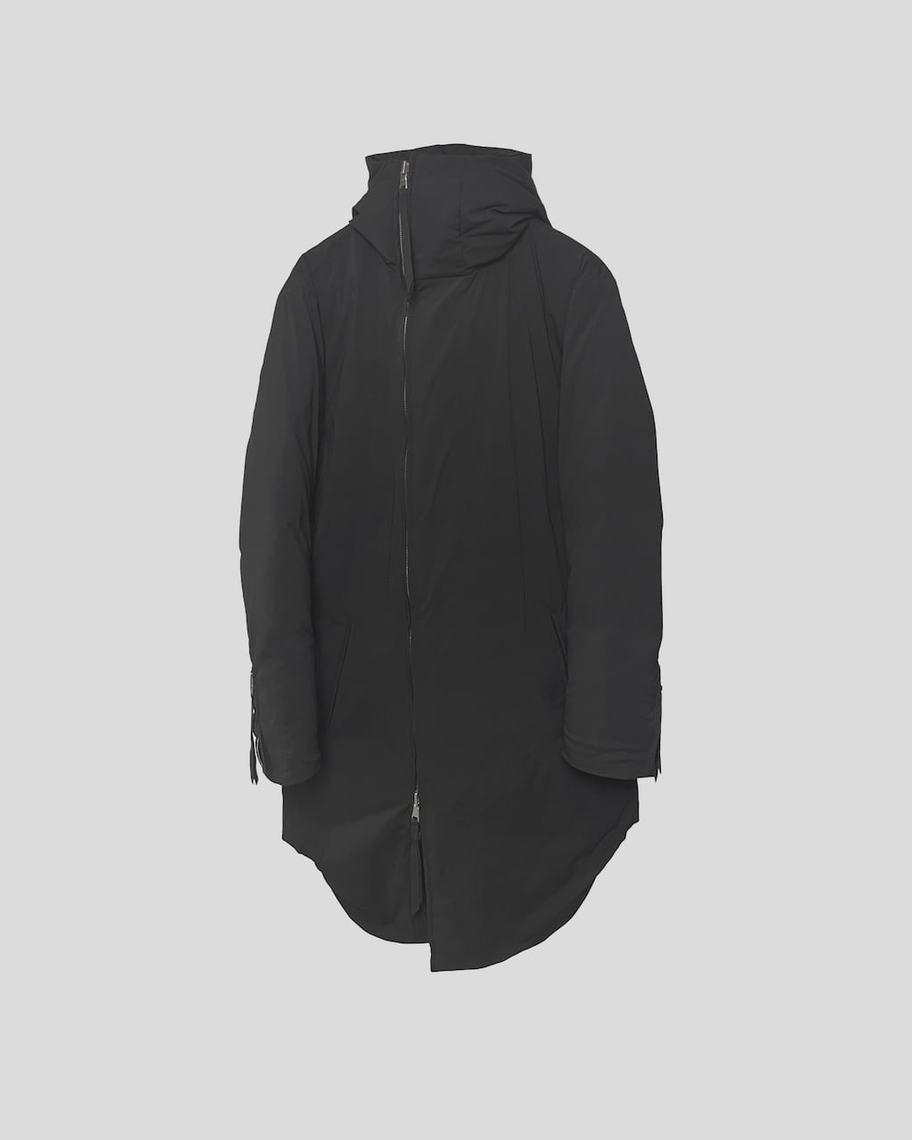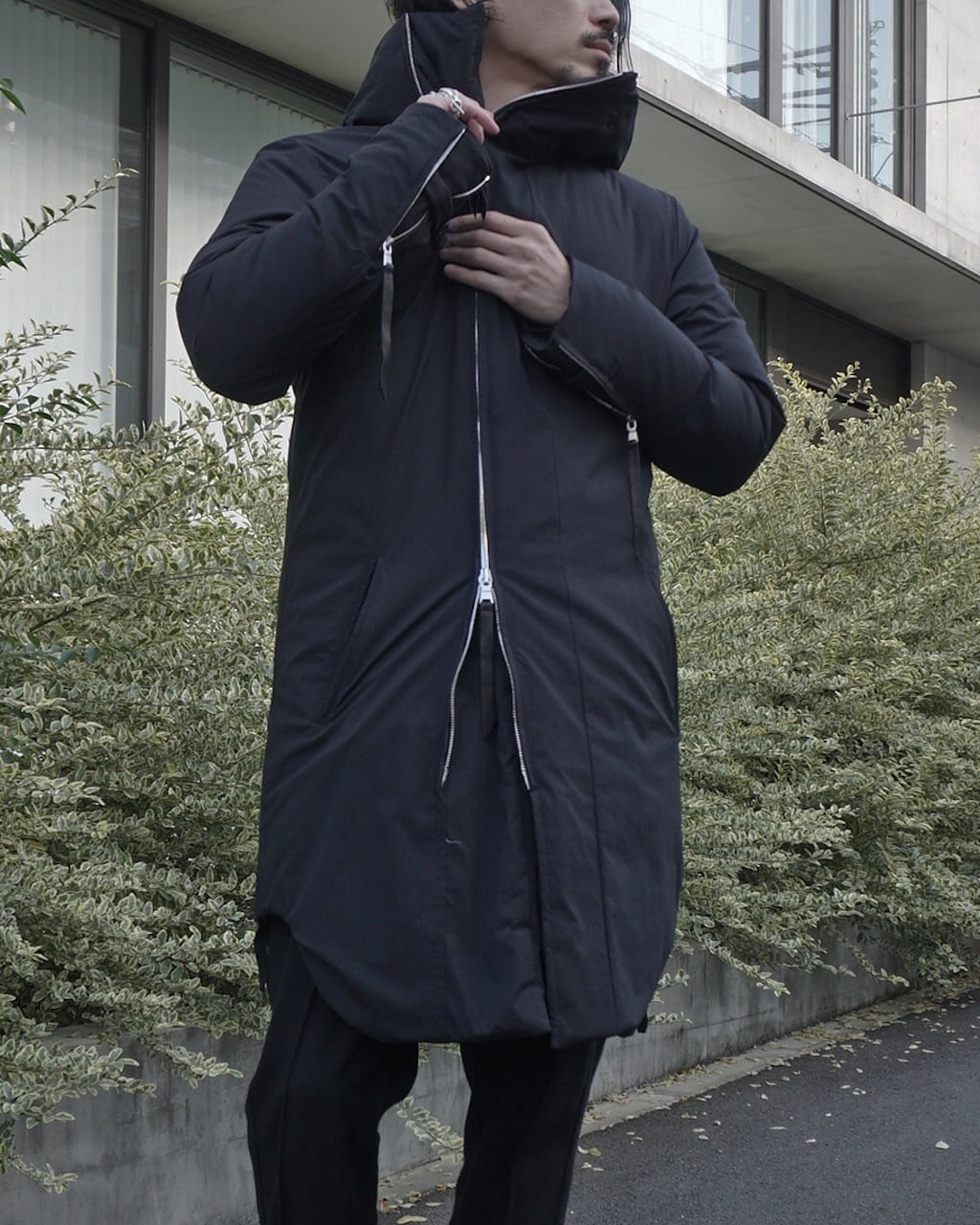 ミニマルに仕上げたハイネックのダウンコート。シンメトリーに見えるよう設計したフロント、ストラップが垂れる袖口など各所にアイデンティティを詰めているが、ダウンだからこそ末長くご愛用頂けるよう普遍的なデザインにまとめている。また、ダウンパックを裏地側に縫製することで表面の凹凸を軽減させスッキリした印象に。ラウンドカーブさせた裾もダウンの見た目の印象を軽やかに演出する。
