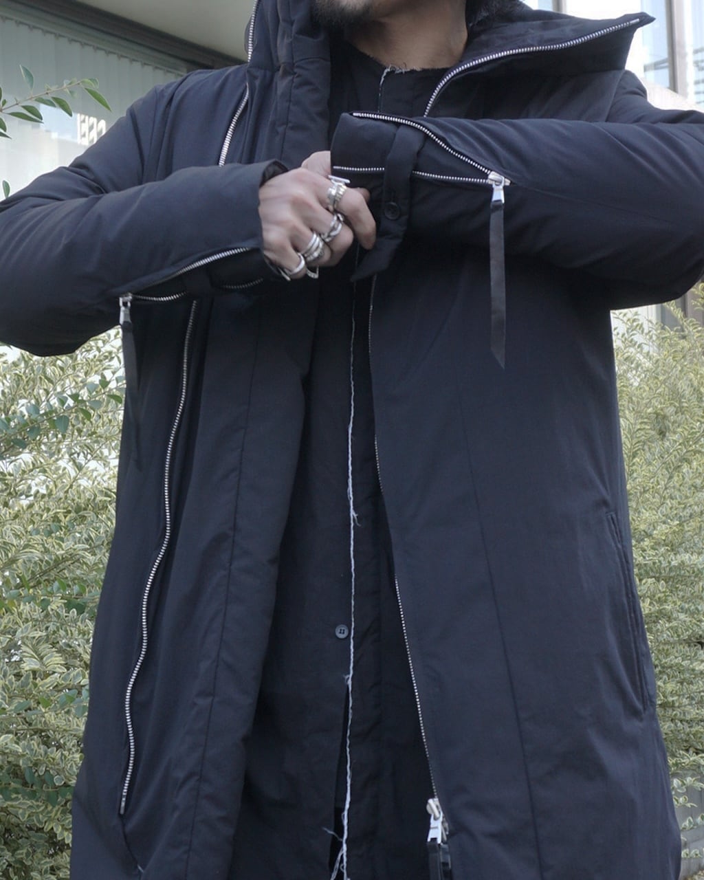 A minimal high-neck down coat. The front is designed to appear symmetrical, and details like the straps hanging from the cuffs add a unique identity to the piece. However, the design remains timeless to ensure long-lasting wear, a hallmark of down coats. Additionally, by sewing the down pack on the lining side, the surface unevenness is reduced, creating a sleek look. The rounded hem also gives the coat a lighter, more refined appearance, avoiding the typical bulkiness of down.