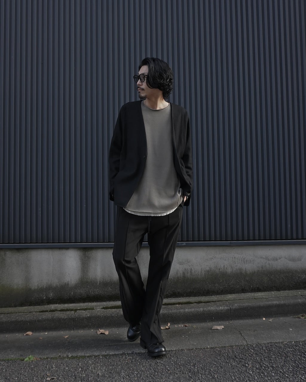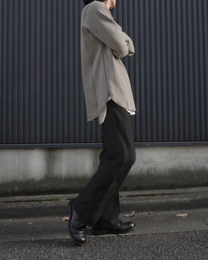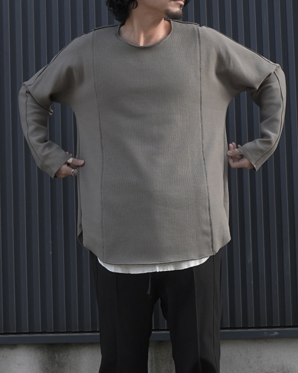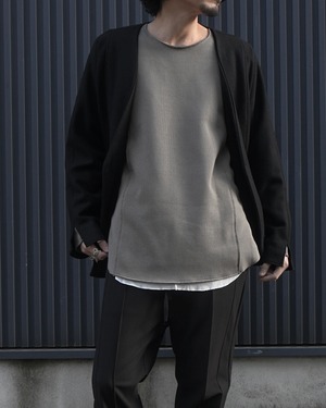 ヘビージャージでハリがありつつもしっとりした秋冬素材。ダブルフェイスになっており、裏毛素材でよくみられる裏面のループは異なる編みによって無くし肌触りを向上。スウェット特有の野暮なカジュアル感はなく綺麗な目地を実現。もっちりとした柔らかさがありつつも耐久性が非常に高く持ちが良い。肌寒い季節に最適な肉厚感。