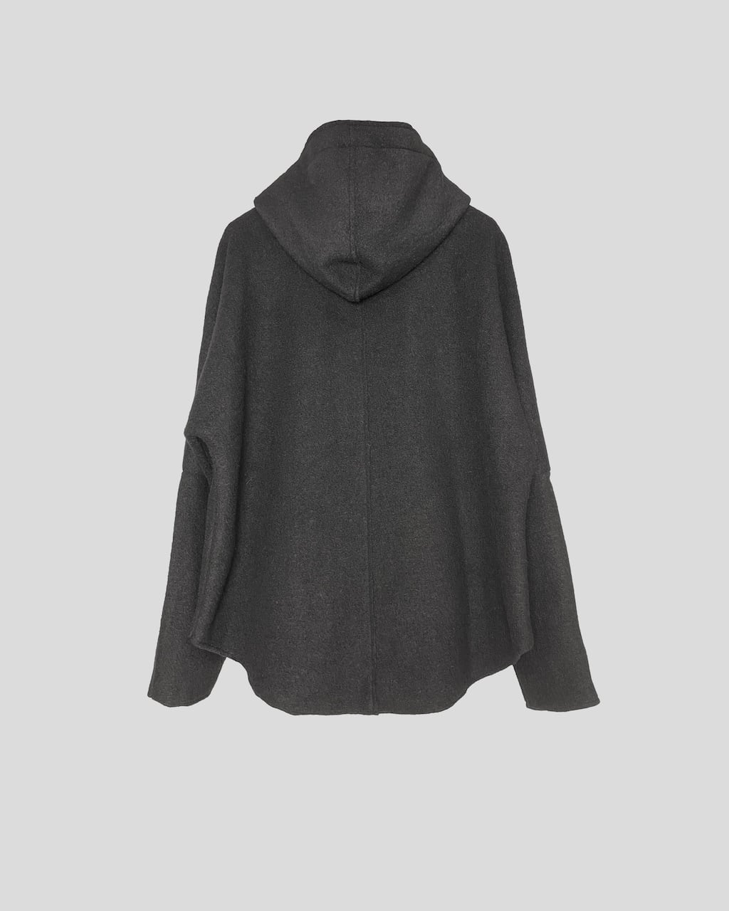 A hoodie-style outerwear designed for ultimate relaxation by eliminating shoulder seams. While differentiating itself from typical sweatshirts, it is crafted to achieve a functionality that closely aligns with them. This piece serves as both a hoodie to layer under a coat and a convenient outer coat on its own. Its exceptionally lightweight feel makes you forget you're even wearing it. The unique dolman sleeve pattern naturally conforms to the body, creating a relaxed and contemporary silhouette. Meticulous attention has been paid to details such as the oversized hood, the omission of ribbing for a cleaner look, and slit pockets instead of kangaroo pockets for a minimalist finish.