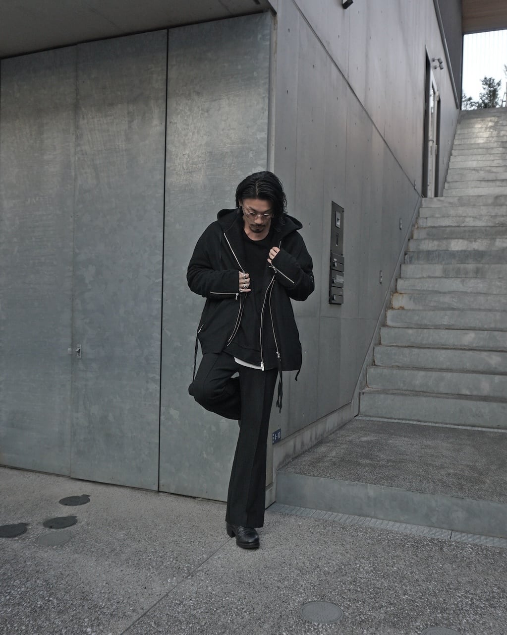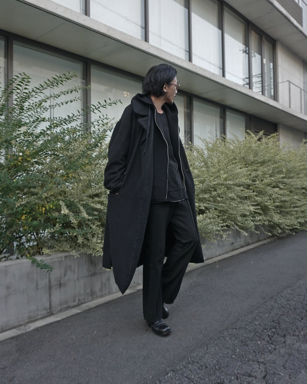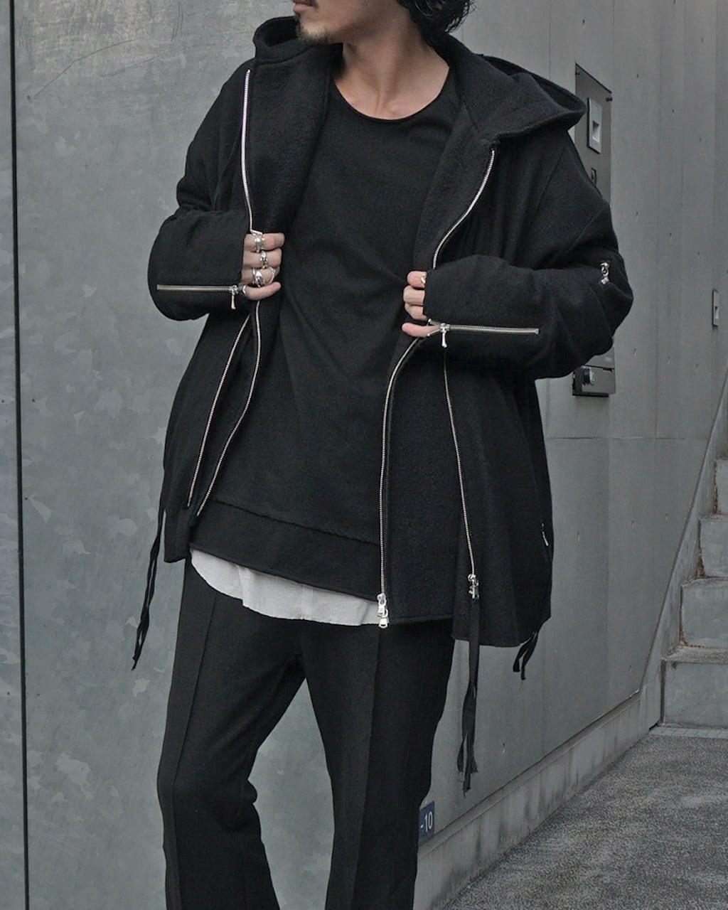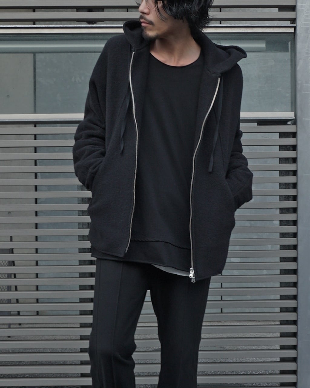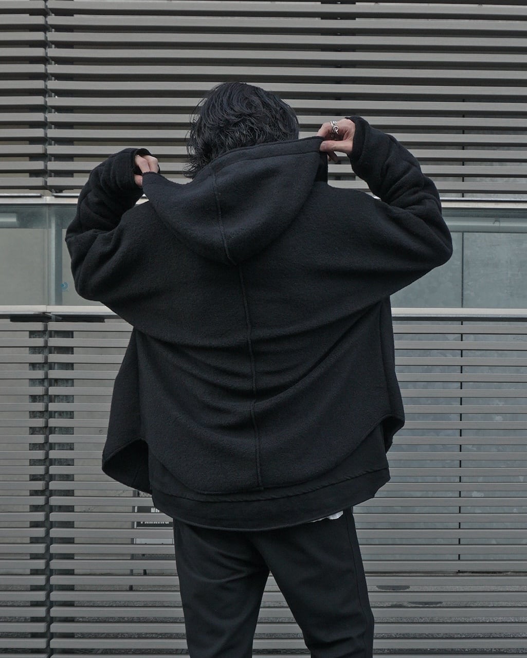 肩線を排除することでリラックスに全振りしたパーカー型アウター。スウェットとの差別化を図りつつ、機能としては相応に近いものを目指し製作。コートの中に仕込むパーカー、或いは外側のコートとしての利便性も兼ね備える。着ていることを忘れるほど大変軽い着用感。独自のドルマンスリーブであるパターンは身体に馴染みやすく、力の抜けた旬なフォルムを形成する。大きめのフード、リブを排除したシンプルさ、カンガルーポケットではなくスリットポケットでミニマルにするなど細部へのこだわりも徹底している。