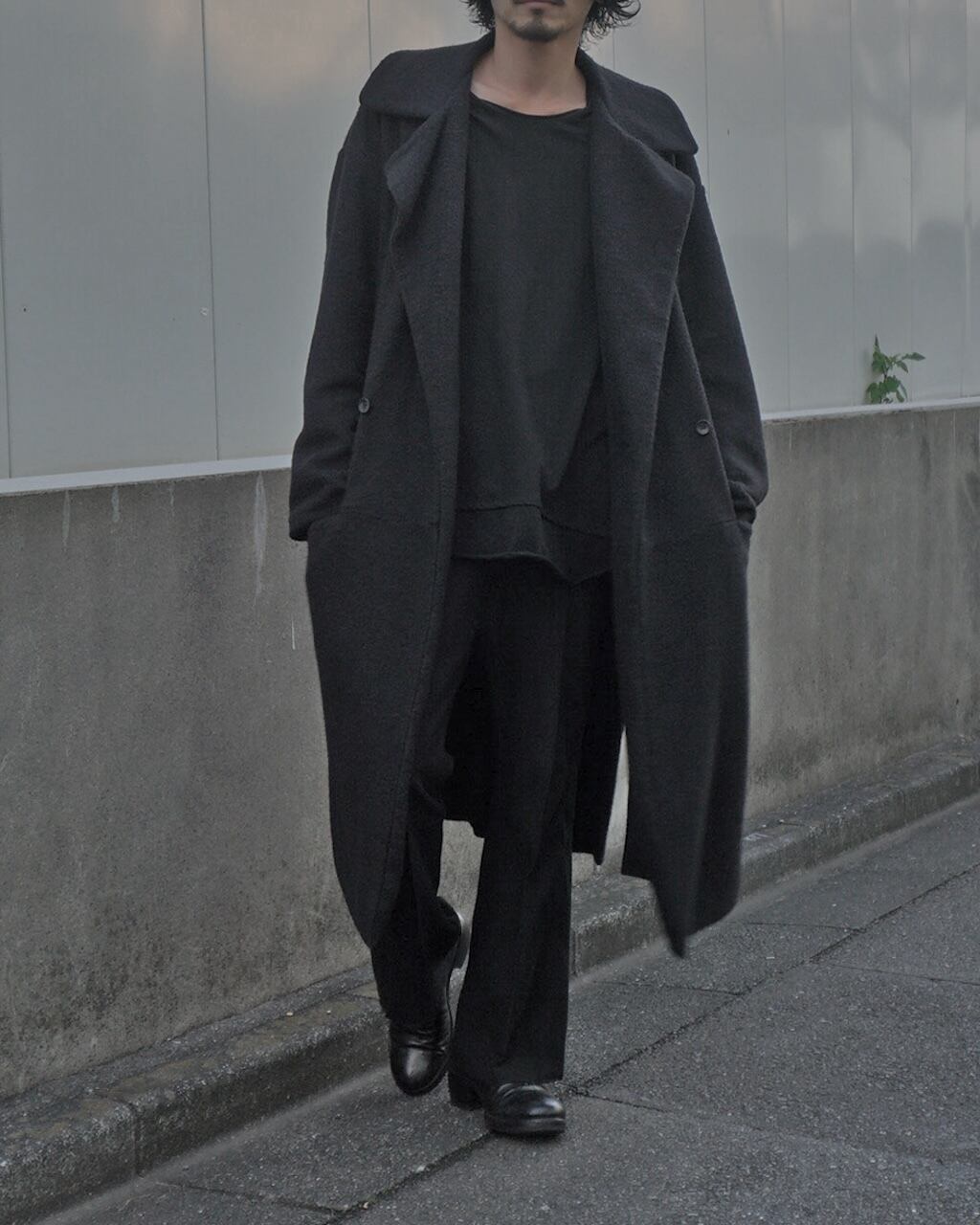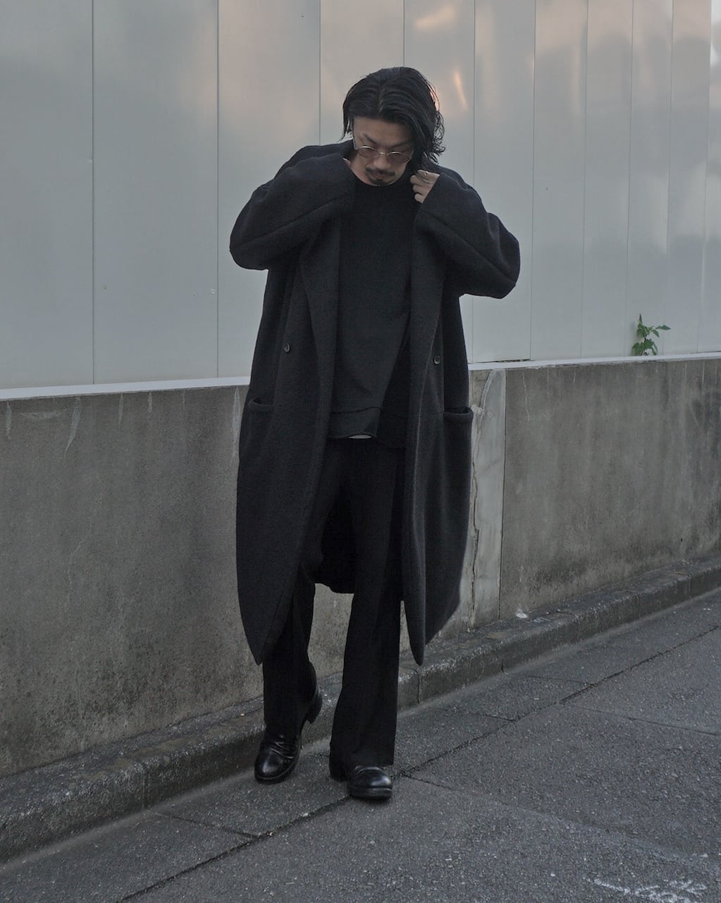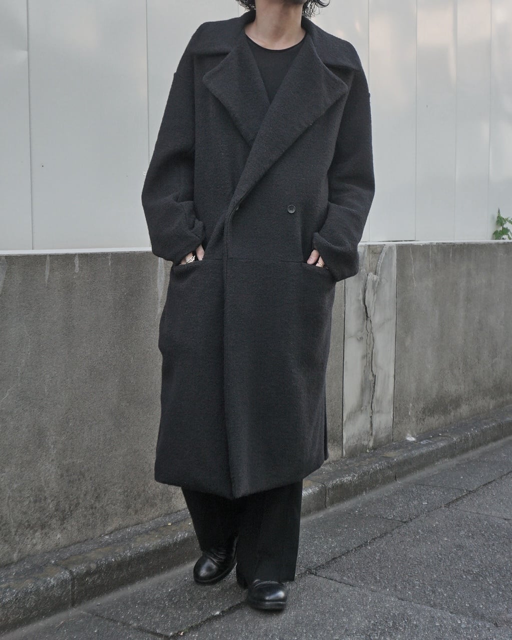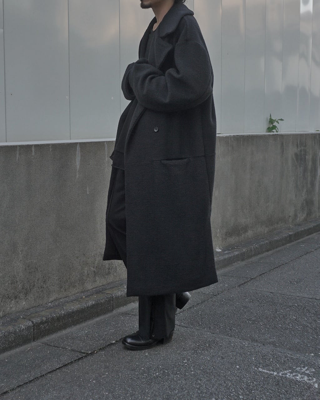 普遍的なダブルプレストで仕上げた新型コート。クラシック性が強い形ながら柔和な素材とのコントラストで緩急をつけASKYYのオリジナリティを追求。渋い印象を保ちつつも旬なバランスを容易に取り入れることが出来る、今季を象徴する一着。大きく包み込むようなフォルムは生地の分量を贅沢にとっており、その見た目に反した異常な軽さも特徴の1つ。既存のコートの上にさらに羽織ることが出来てしまう無比の作品。