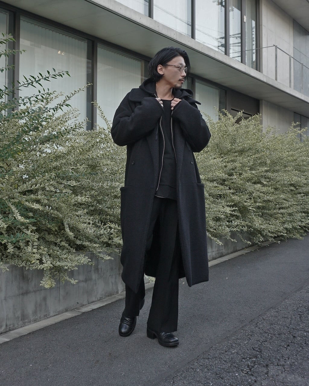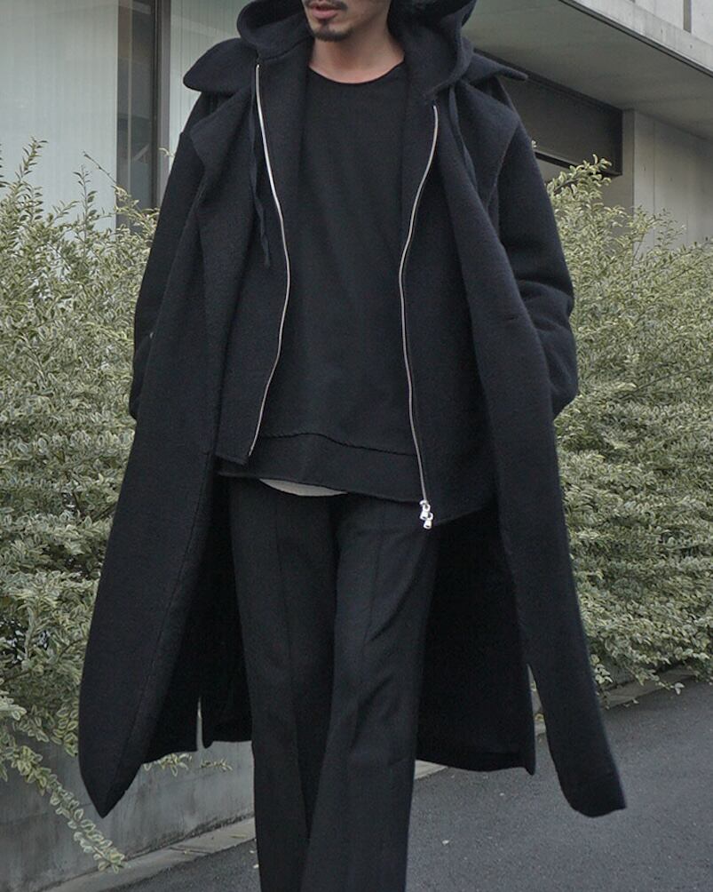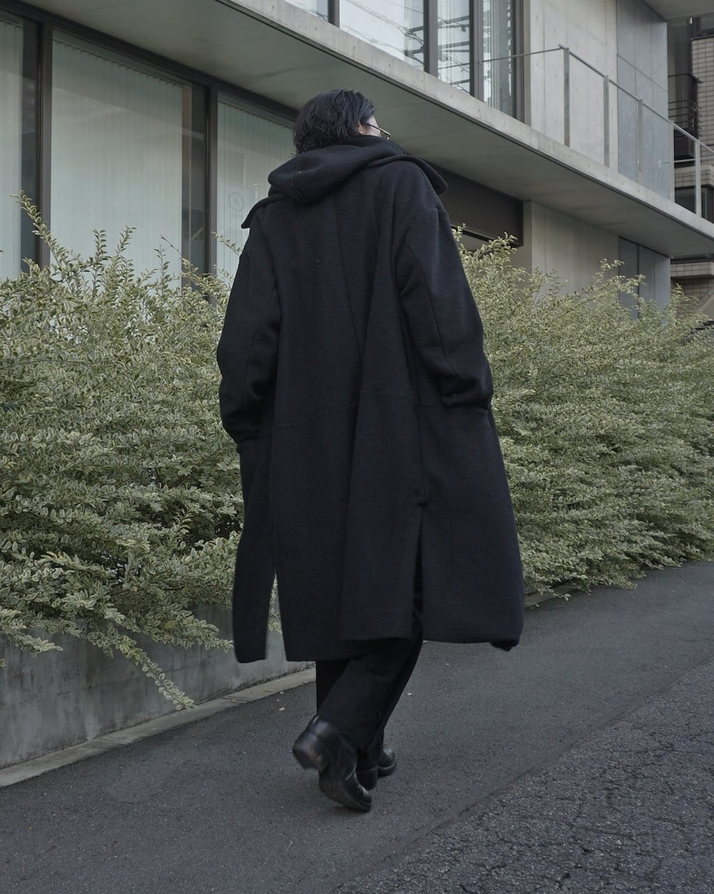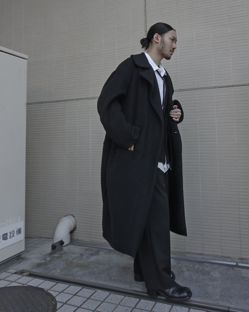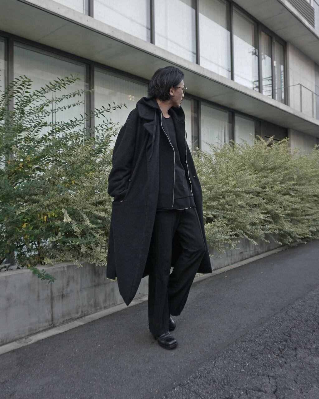 普遍的なダブルプレストで仕上げた新型コート。クラシック性が強い形ながら柔和な素材とのコントラストで緩急をつけASKYYのオリジナリティを追求。渋い印象を保ちつつも旬なバランスを容易に取り入れることが出来る、今季を象徴する一着。大きく包み込むようなフォルムは生地の分量を贅沢にとっており、その見た目に反した異常な軽さも特徴の1つ。既存のコートの上にさらに羽織ることが出来てしまう無比の作品。