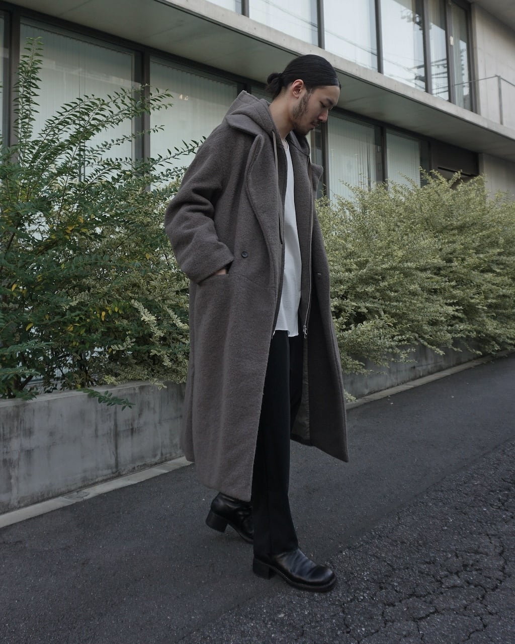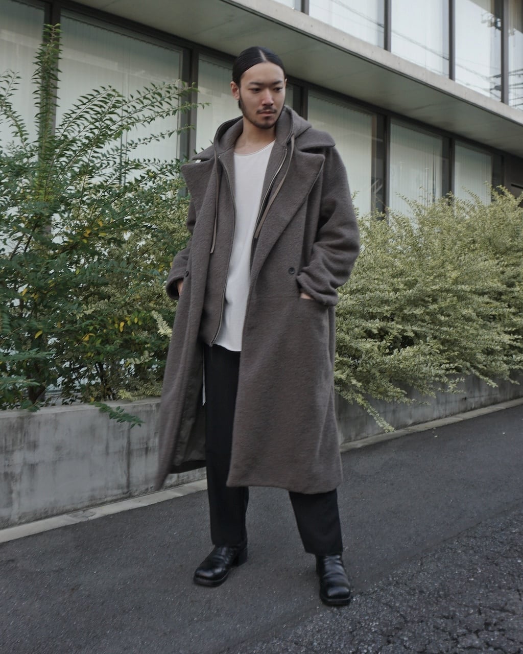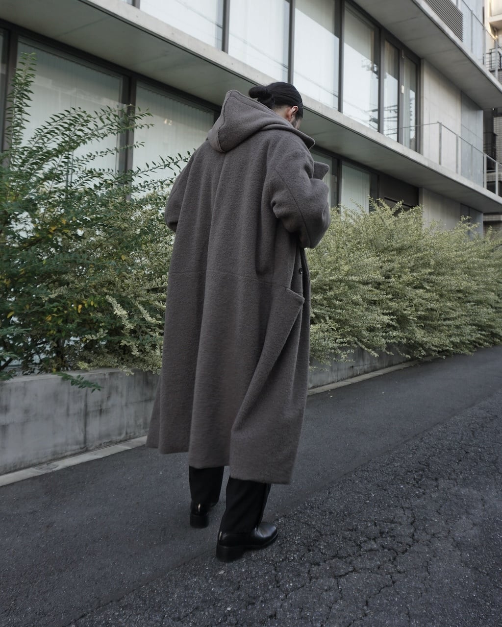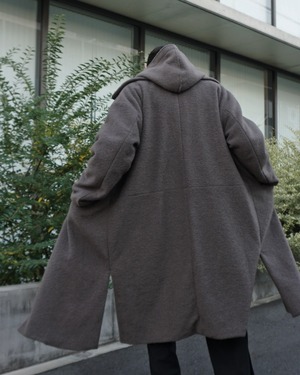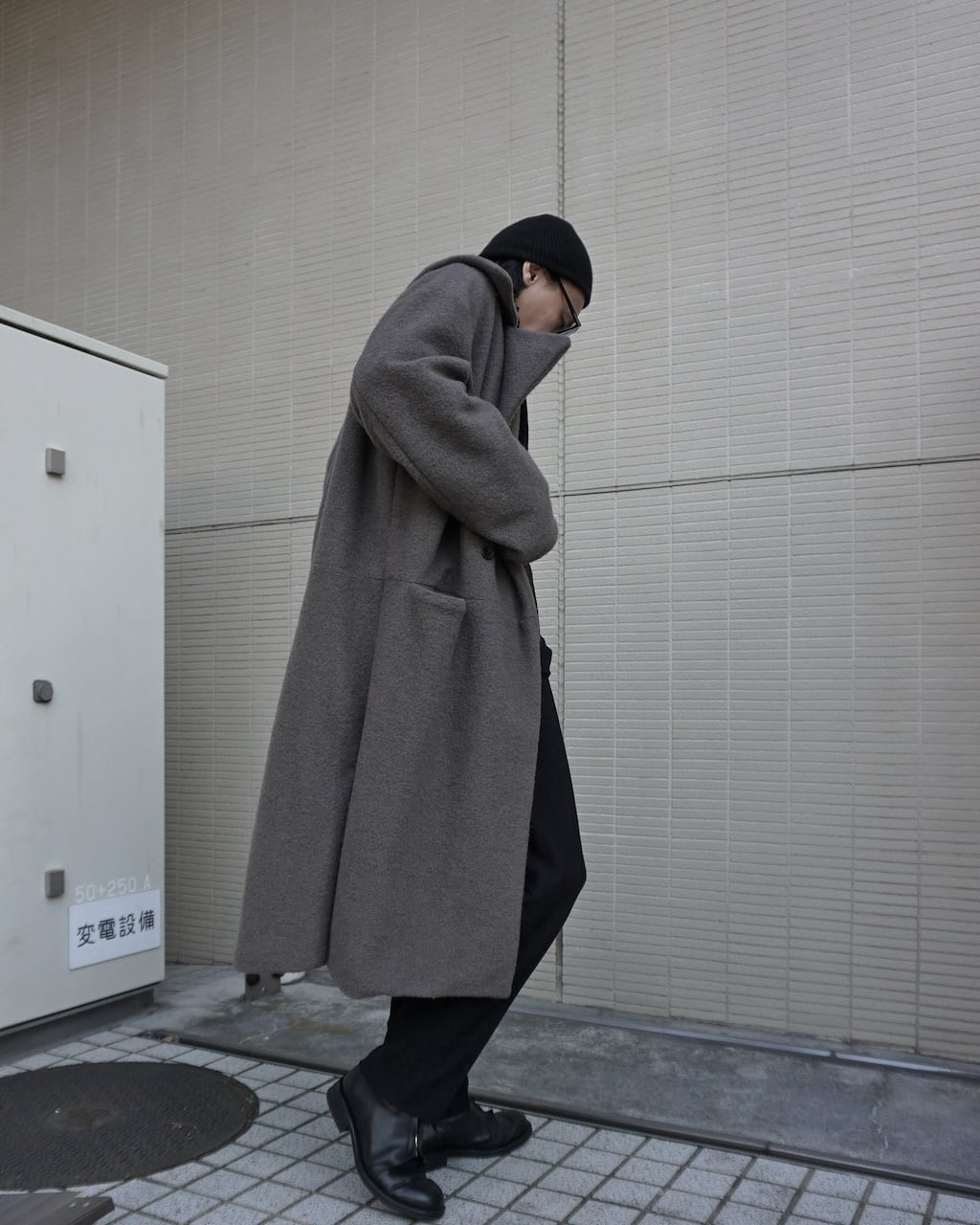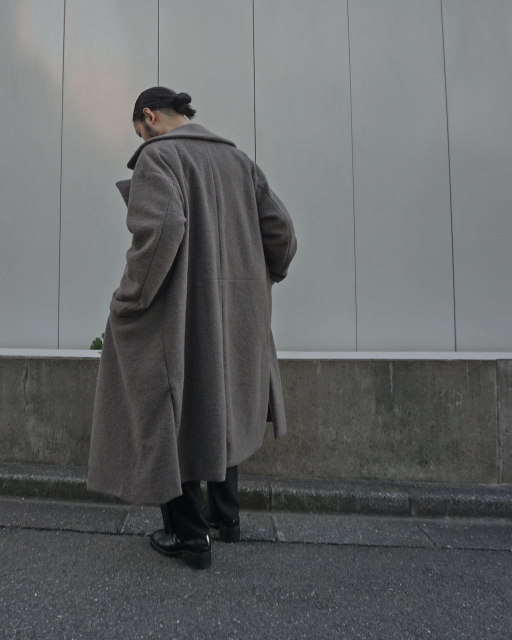 普遍的なダブルプレストで仕上げた新型コート。クラシック性が強い形ながら柔和な素材とのコントラストで緩急をつけASKYYのオリジナリティを追求。渋い印象を保ちつつも旬なバランスを容易に取り入れることが出来る、今季を象徴する一着。大きく包み込むようなフォルムは生地の分量を贅沢にとっており、その見た目に反した異常な軽さも特徴の1つ。既存のコートの上にさらに羽織ることが出来てしまう無比の作品。