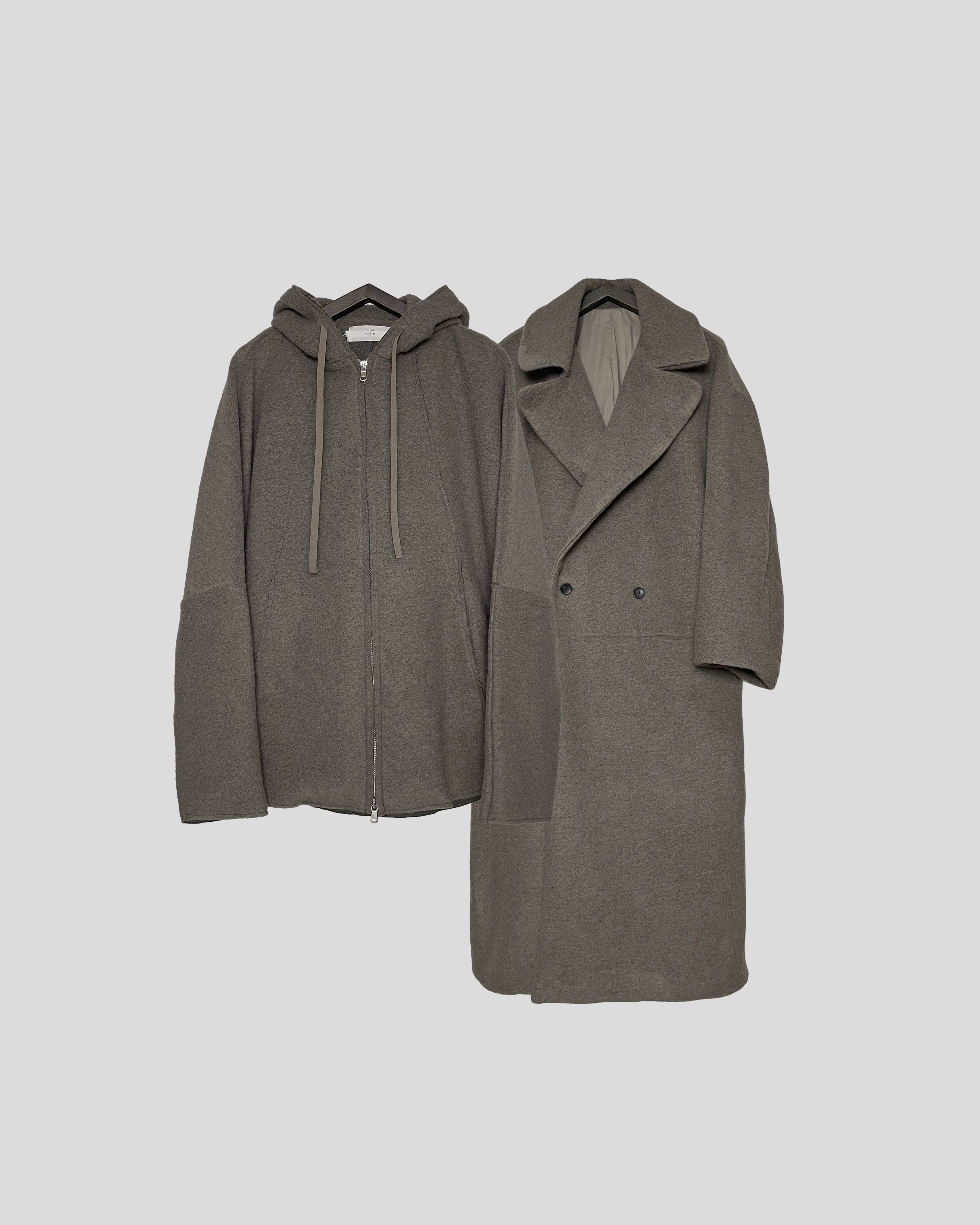 A new double-breasted coat crafted with a timeless design. While maintaining a strong sense of classic elegance, the contrast with its soft, gentle material adds depth and embodies ASKYY's unique originality. This signature piece of the season balances a refined, subdued impression with modern style, effortlessly incorporating contemporary trends. The generously enveloping silhouette, created with an ample use of fabric, exudes luxury while boasting an unexpectedly lightweight feel. A one-of-a-kind creation that can even be layered over an existing coat, offering unmatched versatility.