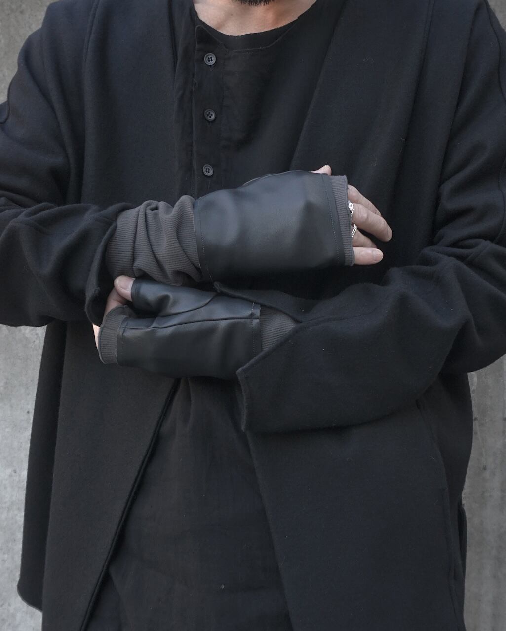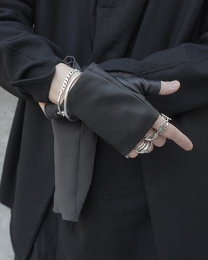 レイヤード仕様のフィンガーレスグローブ。フェイクレザーの表地、ニット素材の裏地はそれぞれ独立しており単体ずつでも着用可能。2枚を重ねることでレイヤードが完成する3WAY仕様。オープンフィンガーのためスマートフォンの操作もしやすく、アクセサリー感覚でコーデにアクセントを与える。スタイリングの味付けとしてもご着用頂きたいアイテム。